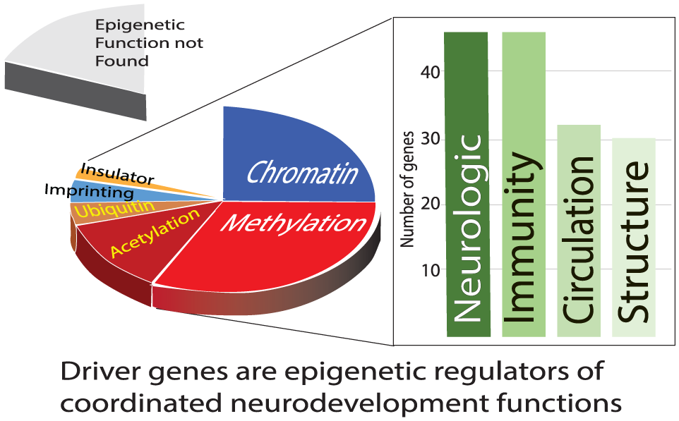 As a result of chromosome anomalies, driver genes truncated or deleted in congenital neurodevelopmental disorders are mainly epigenetic regulators or effectors. The pie chart shows the percentages of 46 driver genes that have the epigenetic functions indicated. Loss of these driver gene functions then impacts a group of functions that must be synchronized during the complex process of neurodevelopment. These are the same general functions lost in deleted gene clusters.