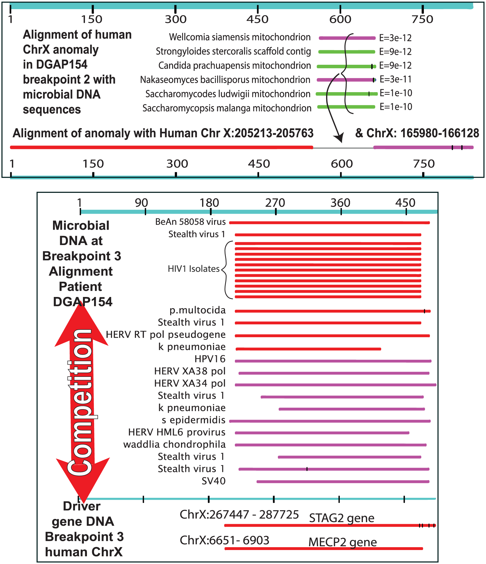 In 48 patients, 1 multiple infection-matching sequences were included in chromosomal anomalies generated by balanced chromosomal translocations (data not shown). Sequences around individual breakpoints were tested for microbial insertions by first comparing the sequences with human and then with microbial DNA. For example, chromosome breakpoint 2 in patient DGAP154 matched human DNA X-chromosome in 2 segments with a gap in the sequence (Figure 7). The gap did not match human sequences but did correspond to nematodes and yeast-like fungi, suggesting one or more of these microorganisms had inserted foreign DNA into patient DGAP154 (Figure 7). More frequently, however, other breakpoints in DGAP154 chromosomes matched many microbial sequences. A simple example of one of these alignments around DGAP154 breakpoint 3 shows that many microorganisms align with human DNA. The similarity between critical human DNA epigenetic factors and microbial DNA (which is more abundant) can set up competitions during recombination and break repair (Figure 7 bottom). Large changes in the sets of homologous foreign DNAs also accompany chromosome gene rearrangements that affect driver genes.