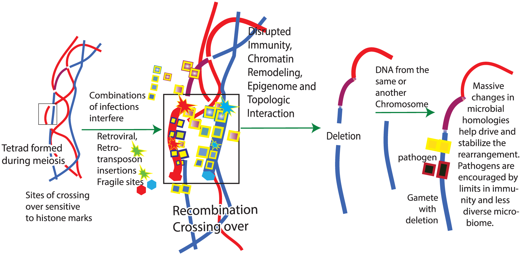 The present work implicates foreign DNA largely from infections as a cause of the chromosome anomalies that cause birth defects. Infections replicate within the human central nervous system by taking advantage of immune deficiencies such as those traced back to deficient microRNA production 8 or other gene damage. Disseminated infections can then interfere with the highly active DNA break repair process required during meiosis. The generation of gametes by meiosis is the most active period of recombination, which occurs at chromatin positions enriched in epigenetic marks. Hundreds of double-strand breaks accompany meiotic recombination. 9 Gametes with errors in how this recombination occurs cause chromosome anomalies in the zygote. In contrast to oocytes, meiotic recombination in sperm cells occurs continuously after puberty.