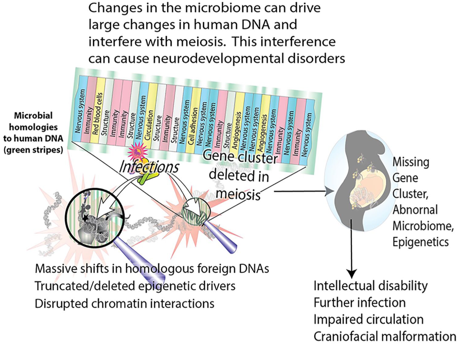 Interference from infection and foreign DNAs can delete or damage human gene clusters and alter the epigenome. This interference accounts for immune, circulatory, and structural deficits that accompany neurologic deficits.
