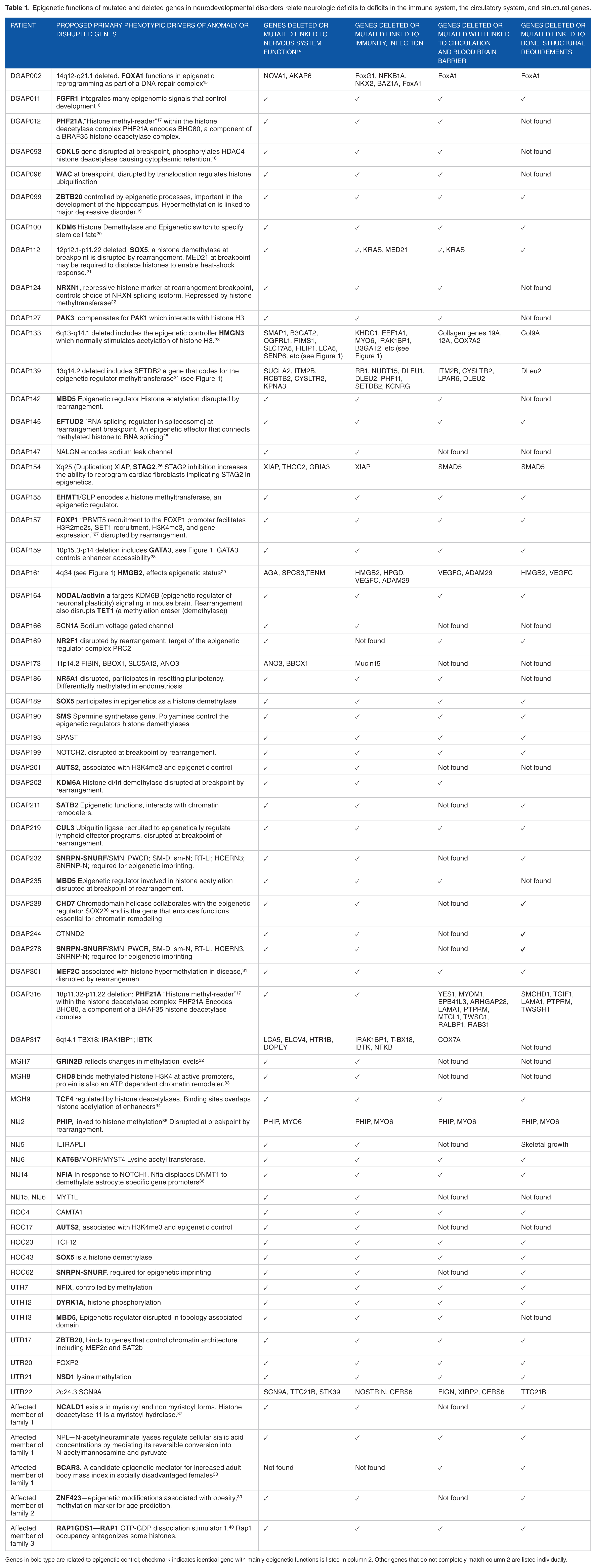 Epigenetic functions of mutated and deleted genes in neurodevelopmental disorders relate neurologic deficits to deficits in the immune system, the circulatory system, and structural genes.