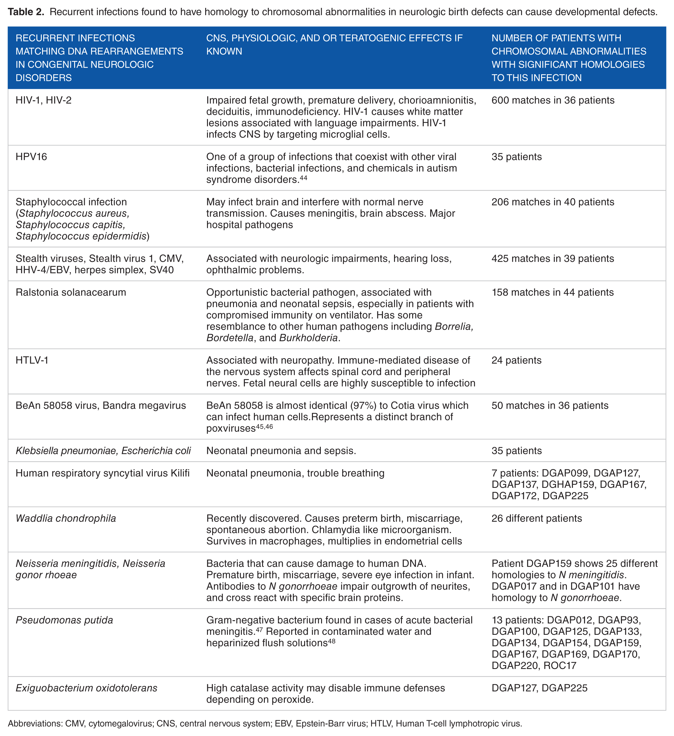 These kinds of alignments suggest candidates that can contribute to the signs and symptoms in each individual (Table 2). Eight patients have growth retardation, and 20 of 48 patients had impaired speech. 1 Multiple infections can cause these problems. For instance, HIV-1 causes white matter lesions associated with language impairments and also harms fetal growth. There are nearly 50 matches to HIV-1 DNA in the chromosome anomalies of 35 patients.