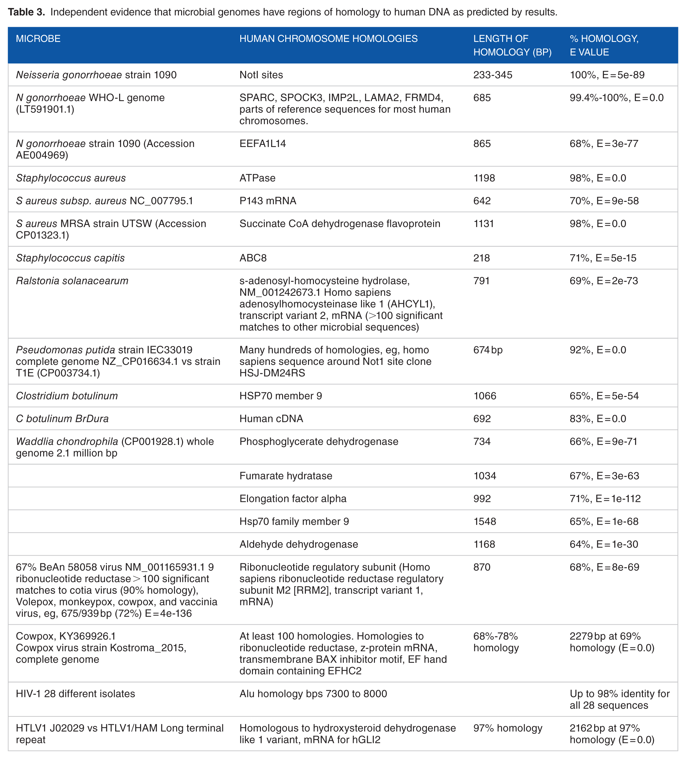 Because homologies represent interspecies similarities, “Discontinuous Megablast” was most frequently used, but long sequences were sometimes tested against highly similar microbial sequences. Significant homology (indicated by homology score) occurs when microbial and human DNA sequences have more similarity than expected by chance (E value ⩽ e-10). 12 Confirmation of microorganism homologies was done by reverse testing multiple variants of complete microorganism genomes against human genomes and by extending the original analyses to 20 000 matches.
