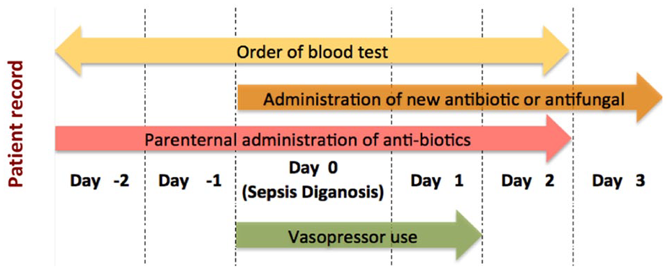 Figure 1 describes the timelines and the clinical criterion used to identify progression to septic shock in a patient during their stay in the ICU. A patient is considered to have gone into septic shock on day 0 if the following conditions are met: (1) Relevant vasopressor use occurs on day 0 and day 1. Vasopressor drugs that were considered are norepinephrine, epinephrine, vasopressin, dopamine, and phenylephrine. Vasopressors were identified from the input events and chart events tables in the MIMIC-III database. (2) Relevant blood culture orders were made from day −2 to day 2 relative to the onset of septic shock. Blood culture orders were identified from the microbiology events table from the database. (3) Administration of a new antibiotic or antifungal from day 0 to day 3 is considered relevant to identification of onset of septic shock. Similarly, parenteral administration of antibiotic between day −2 and day 2 is also considered relevant. Drug administration was identified from the input events table based on National Drug Codes (NDCs). National Drug Codes from the MIMIC-III database were mapped to the complete NDC directory as listed by the Food and Drug Administration. 27 The drug class categories as defined in the NDC directory were used to identify 2704 antibacterial and 560 antifungal drugs. Based on route of administration information from the NDC directory, 1252 antibacterial and 226 antifungal drugs were identified to characterize parenteral administration of antimicrobials. Details corresponding to identification of various features listed here are available in the supplementary material.