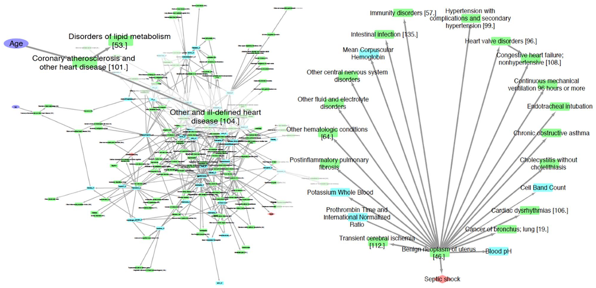 Figure 2 shows the complete cause-and-effect network and some sample subnetworks. The network after filtering out low-frequency edges consisted of 181 nodes connected by 353 edges. When 2 data features are connected by an edge in the network, it should be interpreted as the upstream feature (demographics, diagnosis, procedure, or lab result) probabilistically leading to the downstream feature (new diagnosis, procedure being performed, or specific lab test status) in a patient. For example, from the inset in Figure 2, it can be inferred that patient age trends with high chances of diagnosis of “coronary atherosclerosis and other heart disease.” This inference is in line with the knowledge that the risk of atherosclerosis and heart disease goes up with age. As a second example from the inset panel, “disorders of lipid metabolism” (which includes codes for high cholesterol levels) is linked to “coronary atherosclerosis and heart disease” as expected. A subnetwork around septic shock is shown in Figure 2 (right panel). Several diagnosis code groups and lab tests are linked to septic shock.