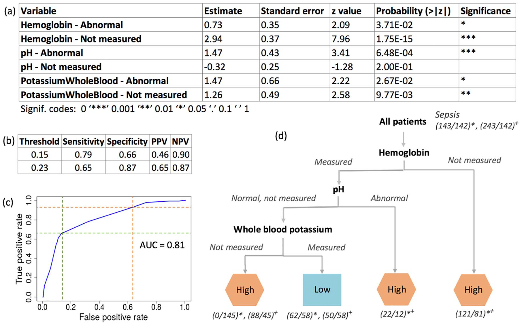(A) This panel shows the details of the regression model for predicting patients’ risk of progressing into septic shock 24 hours prior to diagnosis of septic shock. (B) Two different model cutoffs were selected for assessing model performance. (C) Receiver operating characteristic curve for model. Orange dashed line—0.15 cutoff, green dashed line—0.23 cutoff. The AUC curve was built by interpolating between points measured in the data set as predictive data was discrete. (D) This panel shows a decision tree that represents the regression model used to identify patients at high risk of sepsis. Two different thresholds were selected to allow for different false-negative and true-positive rates. The thresholds are 0.23(*) and 0.15(+). Predictions are made to classify patients as “high” risk and “low” risk. For each prediction, the following information is presented: (number predicted/actual numbers based on assessed septic shock risk). AUC indicates area under the curve; NPV, negative predictive value; PPV, positive predictive value.