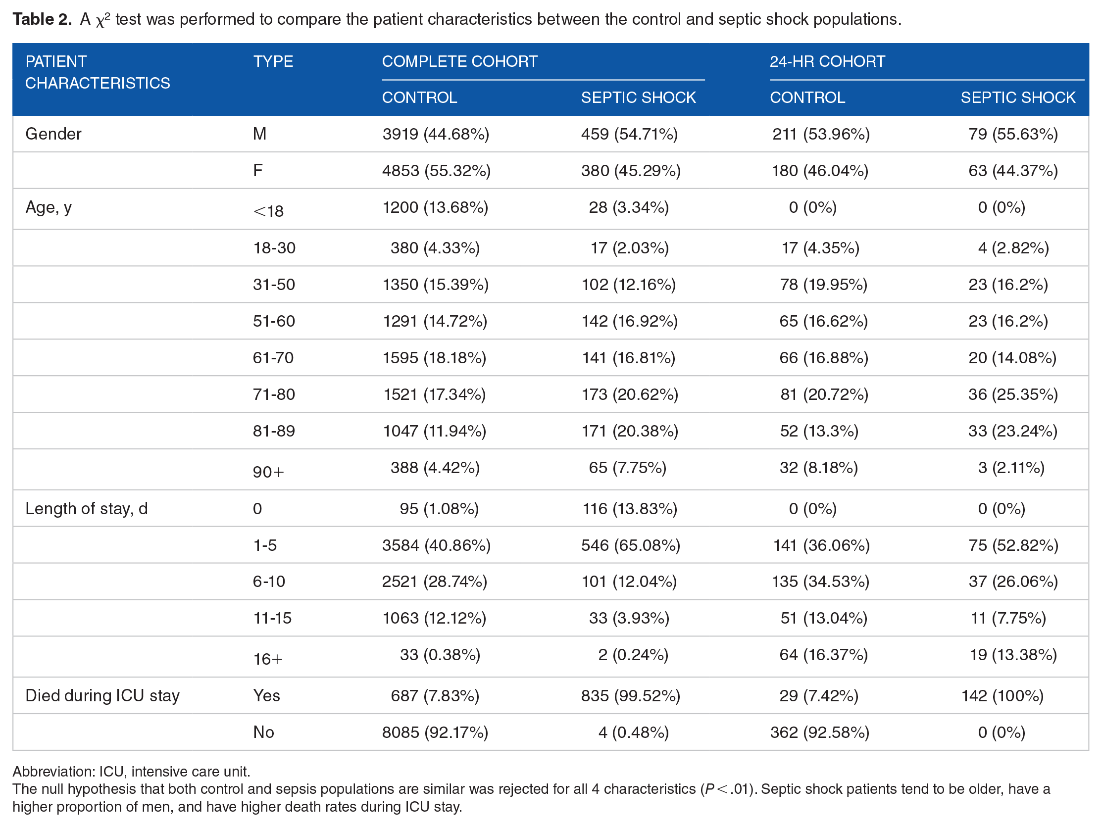 A χ2 test was performed to compare the patient characteristics between the control and septic shock populations.