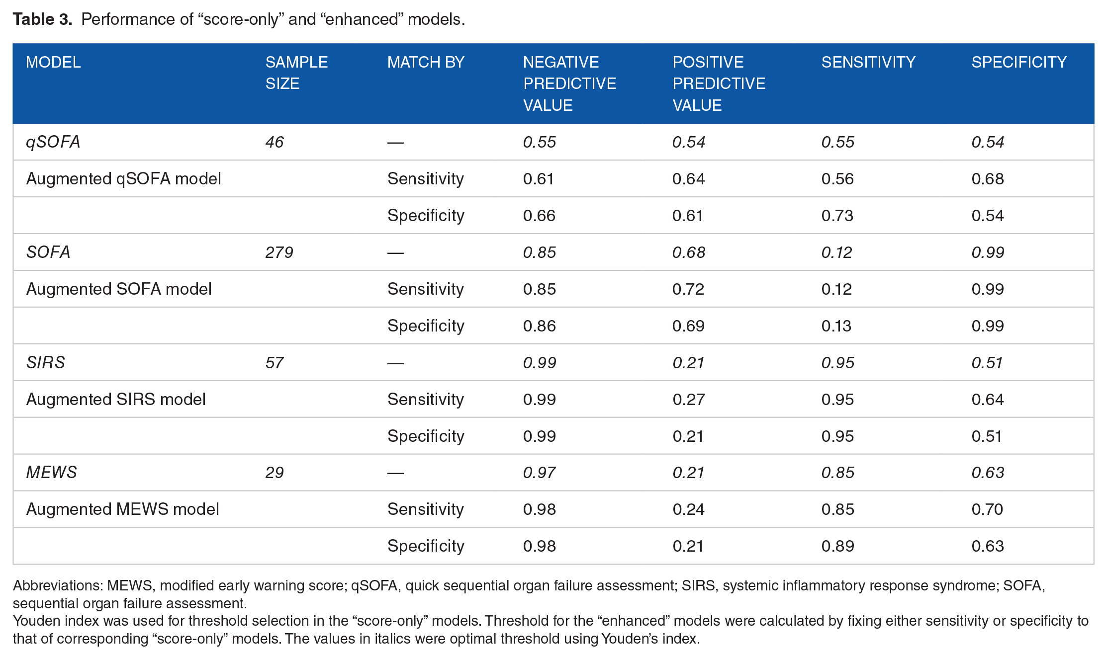 Youden index was used for threshold selection in the “score-only” models. Threshold for the “enhanced” models were calculated by fixing either sensitivity or specificity to that of corresponding “score-only” models. The values in italics were optimal threshold using Youden’s index.