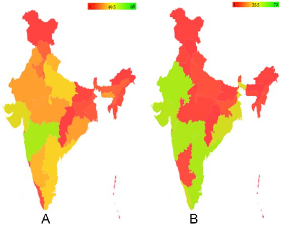 (A) and (B) Plot of groundwater pollution in Indian states. (A) Relative plot of groundwater contamination: Andhra Pradesh, Gujarat, Haryana, Jharkhand, Madhya Pradesh, Meghalaya, Odisha, Uttar Pradesh, Karnataka, and Tamil Nadu are among the leading states with groundwater contamination. (B) Relative plot of states where sulphate contamination is a major source of groundwater pollution: Andhra Pradesh, Gujarat, Kerala, Maharashtra, Odisha, Tamil Nadu, and West Bengal. The maps were generated using the online editable maps available at https://gramener.com/indiamap/.