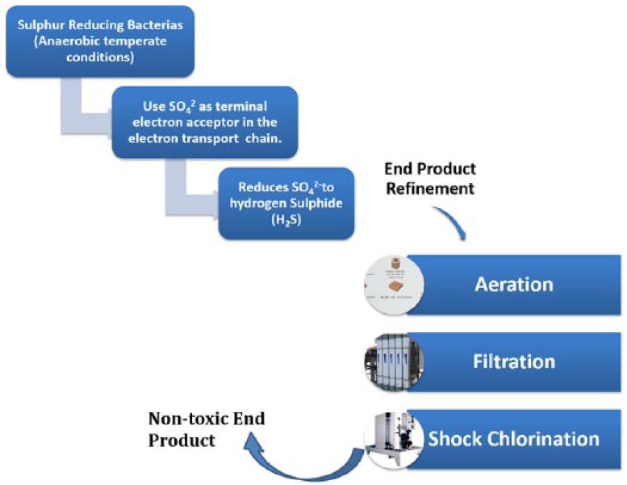 The proposed model of sulphur elimination from groundwater involves initial anaerobic degradation using sulphur-reducing bacteria followed by subsequent tripartite refinement of hydrogen sulphide (toxic byproduct of bacterial metabolism) to nontoxic end products (Figure 3). We prefer labelling our model of sulphur removal from groundwater as ‘biostrategic manipulation’ because the core of this model involves using microorganisms and their metabolism properties to convert sulphur and different complexes of sulphates into hydrogen sulphide. This is further strategically eliminated by 3-step cleanup procedure involving constitutive aeration, filtration, and shock chlorination. To provide theoretical support and infrastructural feasibility, we have assessed this model based on similar models deployed at sulphur elimination plants at Minnesota, USA, that had shown 60% result efficiency. 18