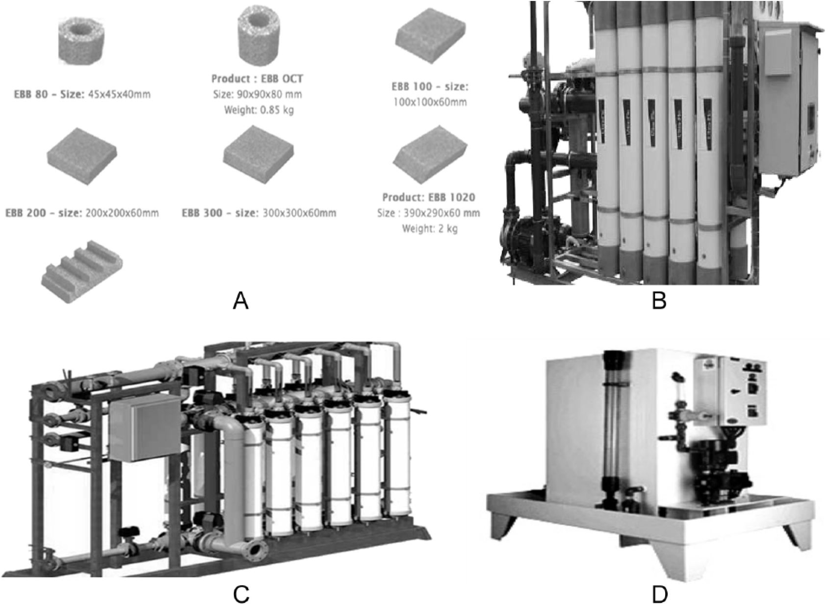 Schematic representation of constitutive aeration, filtration, and shock chlorination apparatus and kits: (A) constitutive aeration kit called ‘Eco-bio blocks’ of different dimensions, (B) ultrafiltration filtration apparatus, (C) nanofiltration filtration apparatus, and (D) shock chlorination apparatus.