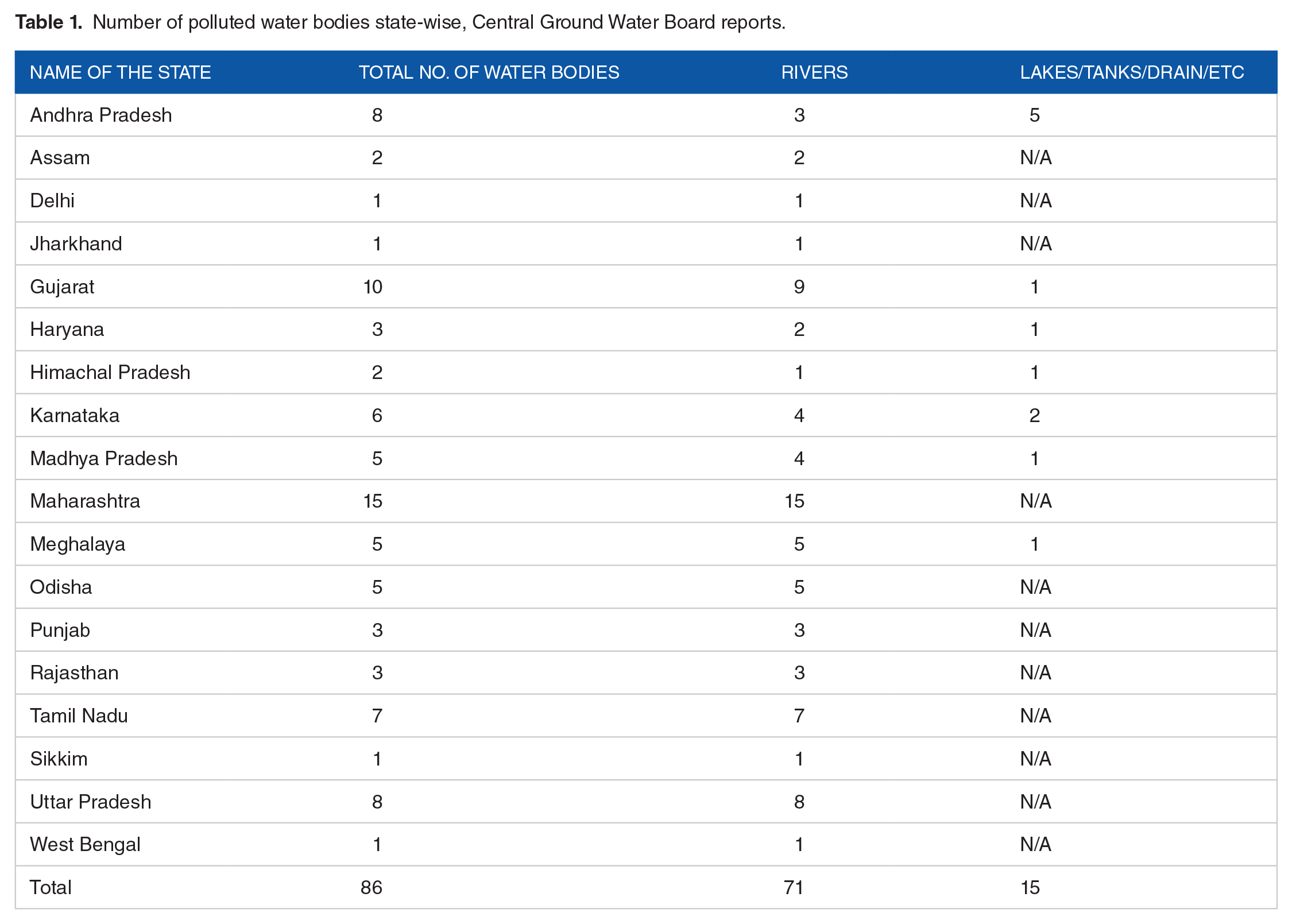 Broadly, the common pollutants reported from various parts of the world can be grouped as physical, chemical, biological, and radioactive solids or soluble chemicals. 3 The regulation and measurement of these contaminants in India are performed by a large-scale survey consisting of sampling and measurement from various potential locations done by Central Ground Water Board (CGWB). 4 Like the rest of the world, India has witnessed a heightened change in the physical and chemical properties of groundwater owing to changing natural conditions in the form of local geology, climate pattern change, and frequency of rainfall changes taking place over decades. Apart from these natural deviations, a developing economy like India has witnessed excessive utilization of low-cost fertilizers and pesticides, noncentralized sewerage system, open dumping of toxic industrial effluents, and over-abstraction of water. This has led to percolation of contaminants into subsurface zone of saturation in aquifers. 3 Also, the microbial population residing in these voids mediate several biogeochemical reactions leading to alterations of rock composition and release of free minerals into these aquifers. 5 The latest groundwater reports of CGWB, in 2007, identify an average presence of high salinity with an increase in the levels of nitrates, chlorides, sulphates, and suspended particulates.2,4 Degradation of groundwater can be noticed in distance of primary water source, indicating a secondary mechanism of diffusion and percolation of contamination nearby the industrial and densely populated areas. 3 Thus, not only the primary sources of industries but also the nearby places can be categorized as problem areas for understanding groundwater contamination. 3