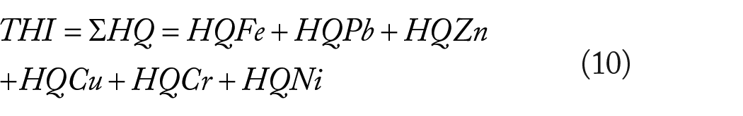 A noncarcinogenic risk for individual metal expressed as hazard quotient (HQ) was evaluated using equation (10)