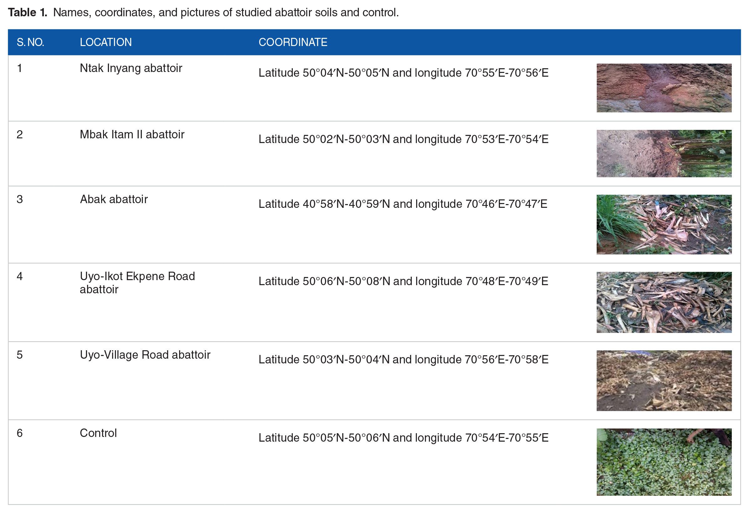 The studied locations, their coordinates, and some images are shown in Table 1. Figure 1 shows the location of the studied abattoirs in Akwa Ibom state.