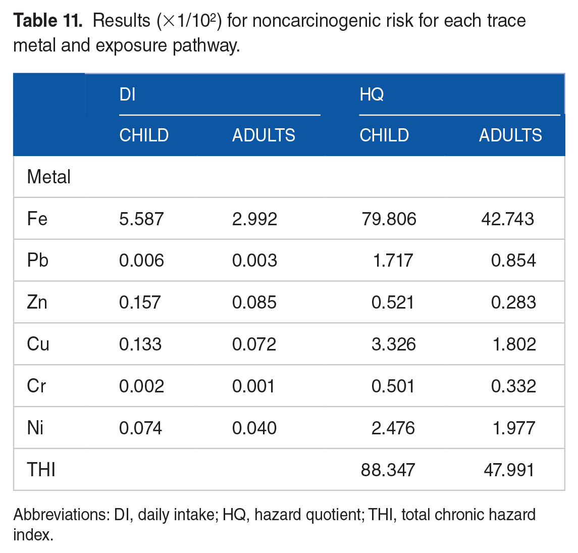 The results for HQ for the metals determined in the studied abattoir soils are shown in Table 10. The HQ for each of the metal is less than 1; thus, these metals may not be hazardous to both the children and adults. The HQ values for trace metals in children is in the order Fe > Cu > Ni > Pb > Zn > Cr, while for the adults is in the order Fe > Ni > Cu > Pb > Cr > Zn. Accordingly, Fe recorded the highest HQ value for both the children and adults. The lowest HQ values for the children and adults were recorded by Cr and Zn, respectively. Consequently, the potential risk of Fe toxicity is high in both the children and adults, but children were more vulnerable than the adults. Although the THI value is less than 1, there is a tendency of these people being exposed to noncarcinogenic health problems which are directly proportional to the THI value. 121