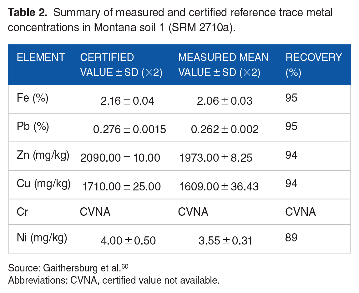 Summary of measured and certified reference trace metal concentrations in Montana soil 1 (SRM 2710a).