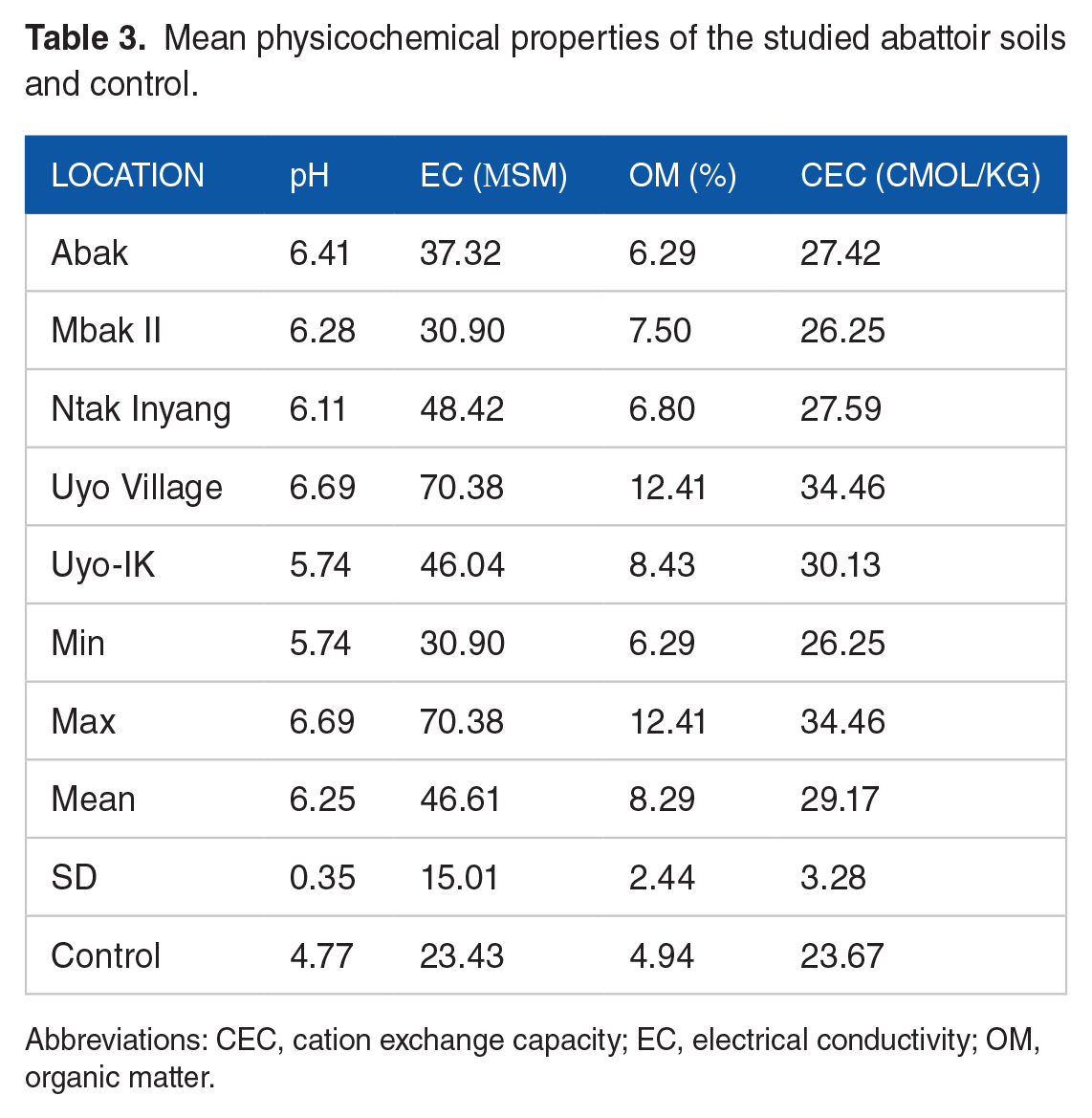 The results for physicochemical properties of studied abattoir soils and control are presented in Table 3. pH of the studied abattoir soils varied between 5.74 and 6.69 with a mean of 6.25 ± 0.25. This pH range is lower than 6.22 to 7.44 reported by Chukwu and Anuchi, 49 consistent with 4.99 to 6.73 obtained by Ubwa et al 24 in abattoir soils. The mean pH value obtained in studied soils is above 4.77 reported in the control. Thus, the waste products generated within these abattoirs may have affected the pH of the studied abattoir soils, thereby making the pH of the soils more alkaline than the control. This could be the impact of higher OM and CEC of soils.72,73
