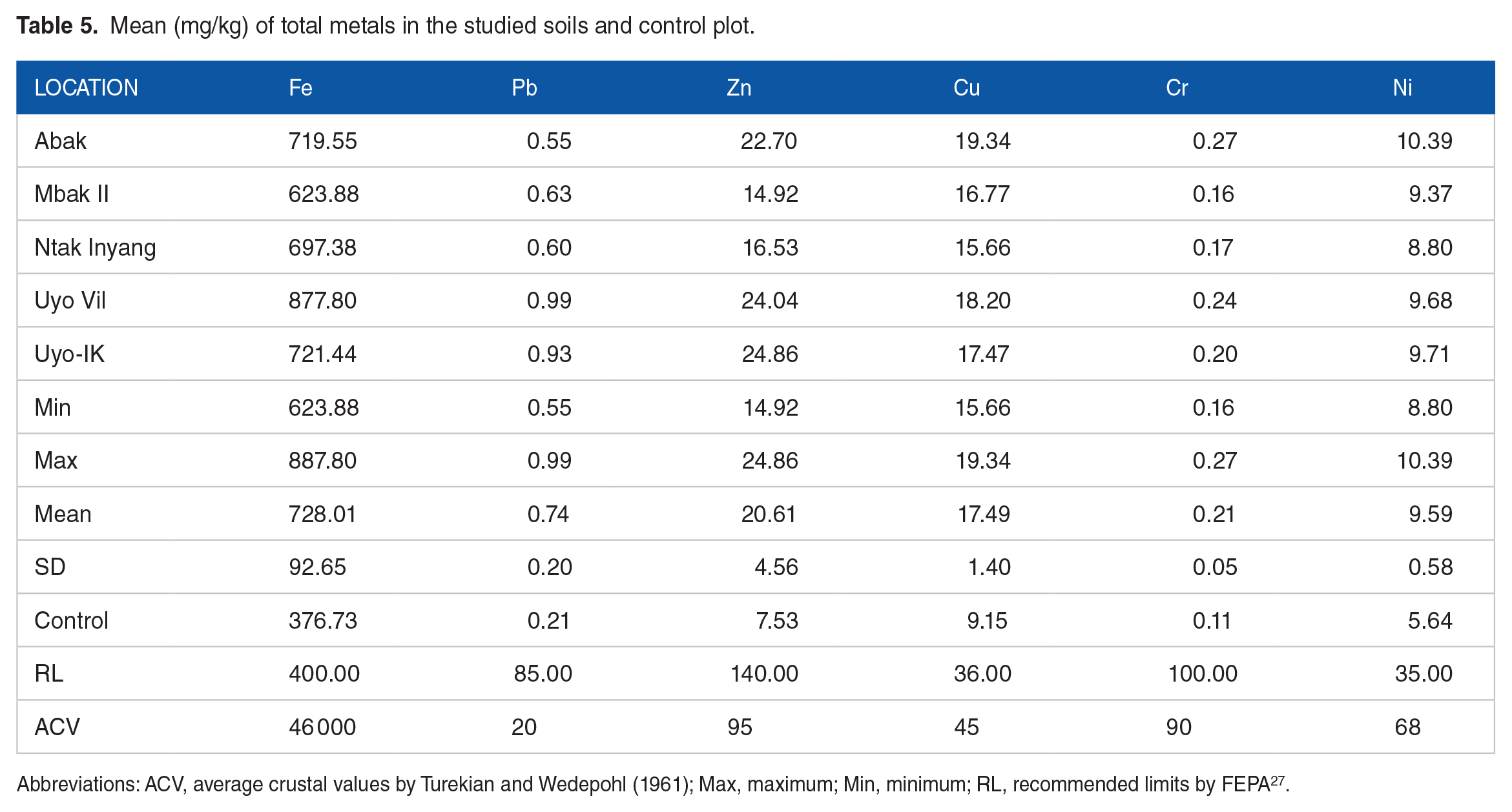 The top layer (0-15 cm) of the studied soils was selected, and samples were collected from 3 separate points and merged together to form a composite sample for the location. 50 At each location, 15 subsamples and 5 composite samples were obtained for this study. Samples were collected between December 2015 (dry season) and May 2016 (wet season) to cover the climate of the study area. Surface soil samples were collected within the same period from a garden in Uyo local government as well and used as control. A total of 90 subsamples and 30 composite samples were obtained for this study. Soil samples were air dried for 3 days, ground, and sieved using a 2-mm mesh. One gram of the sieved soil sample was mixed with aqua regia (HCl and HNO3 in the ratio of 3:1) and digested on a hot plate. The levels of Fe, Pb, Zn, Cu, Cr, and Ni in filtrates obtained from the digestion process were analyzed using an Agilent 710 inductively coupled plasma optical emission spectrometer (ICP-OES). The instrument was standardized following the requirements by ISO 11466 and ISO/IEC 17025.51-53