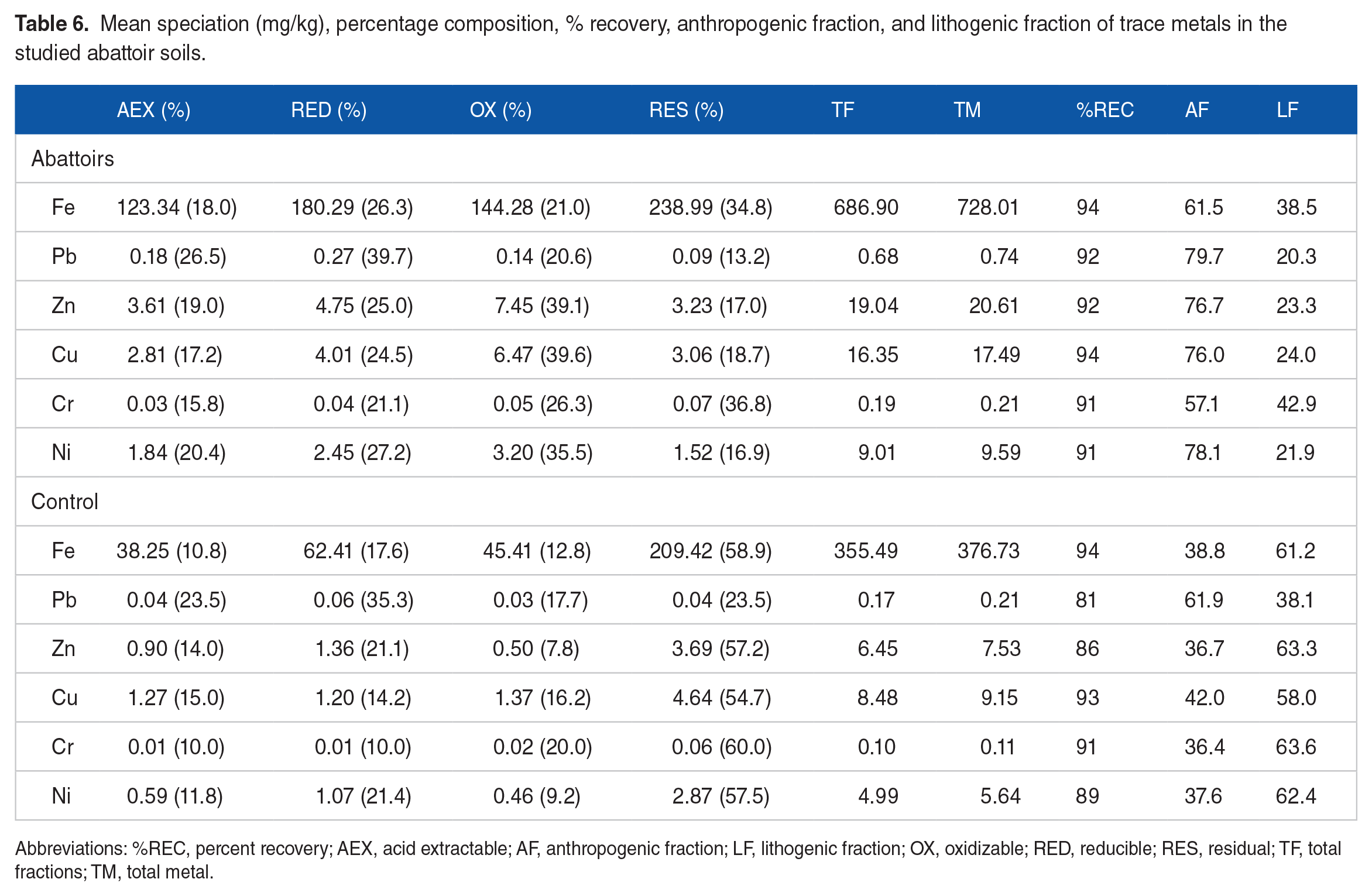 The results of sequential extraction of trace metals in the studied abattoir soils and control are shown in Table 6. The results revealed that Fe existed mostly in the residual (inert) fraction both in the studied soils and control. This is in agreement with the findings by Fagbote and Olanipekun 91 and Osakwe. 92 The residual fraction contributed 34.8% and 58.9% of the several fractions in abattoir soils and control, respectively. The proportions of other fractions of Fe are indicated in Table 6. The high proportion of Fe in the residual fraction is an indication of its low bioavailability. As indicated in Table 6, the human factor (anthropogenic) contributed 61.5% of Fe in the studied soils, while the natural influence supplied 38.8%. However, 61.2% of Fe was contributed by the natural source in the control soil, while anthropogenic factor contributed 38.6%. Accordingly, wastes from abattoirs might have added significant amounts of Fe to the underlying soil as reported by Osu and Okereke. 25 The proportion of the different fractions of Fe in both the studied soils and control followed the order RES > RED > OX > AEX.