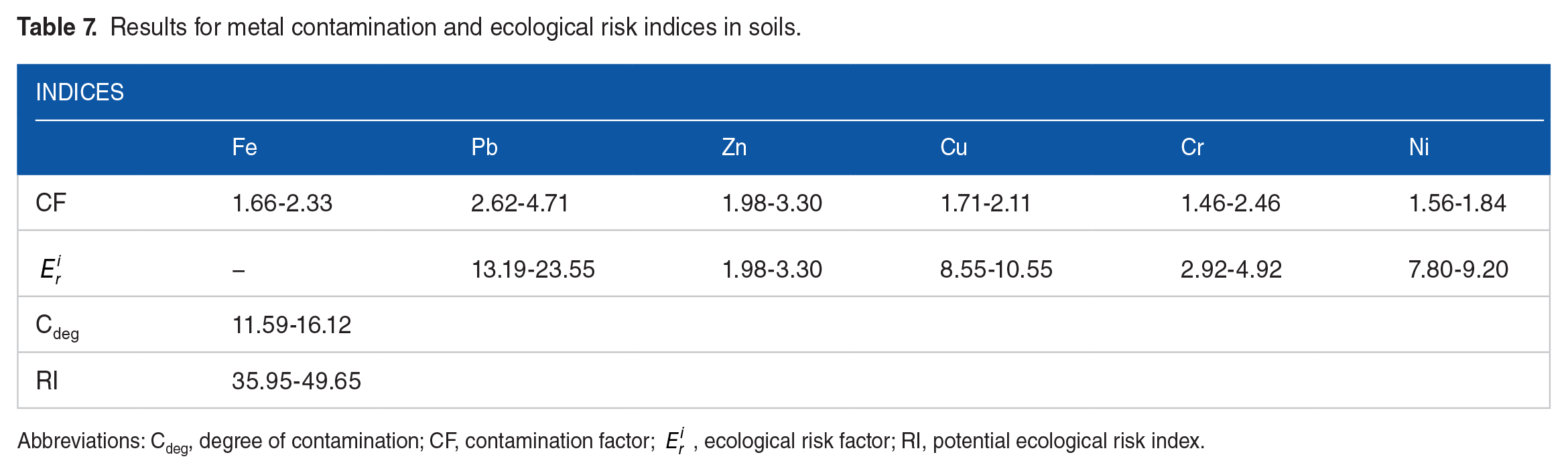 The average crustal values of these elements in Table 3 were used as the background levels for the metals. The results of the CF of metals in the studied soils are shown in Table 7. The CF values of Fe ranged from 1.66 to 2.33; thus, it belongs to the moderate contamination class. The CF of Pb varied between the moderate and considerable contamination classes with a CF range of 2.62 to 4.71. The CF for Zn also varied between the moderate and considerable contamination classes. However; the CF for Cu, Cr, and Ni varied as follows: 1.71 to 2.11, 1.46 to 2.46, and 1.56 to 1.84, respectively. Consequently, Cu, Cr, and Ni belong to the moderate contamination class.