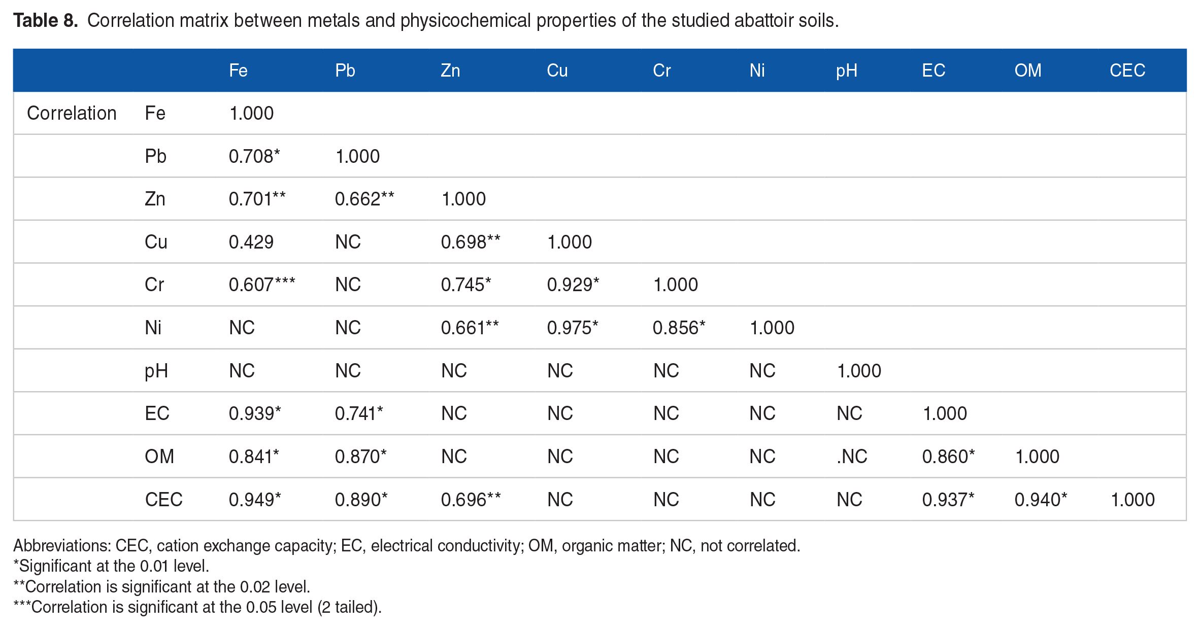 The interrelationship among trace metals and other properties in the studied abattoir soils was evaluated with correlation analysis. Table 8 indicates that Fe correlated positively and significantly with Pb, EC, OM, and CEC at 99% confidence limit, but with Zn at