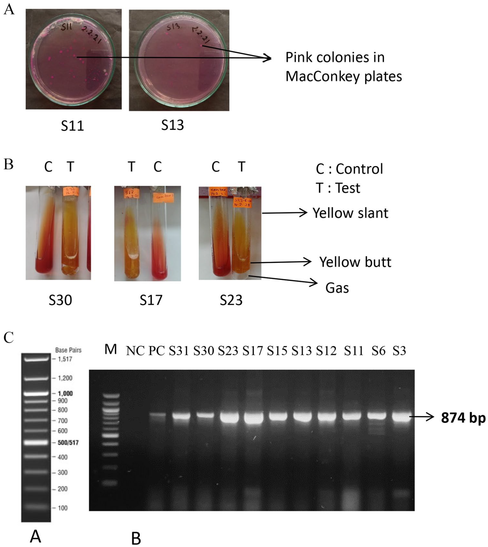 This research project has been designed to investigate the occurrence of coliform bacteria in the drinking water of different public places in Chattogram city, Bangladesh (Table 2). To identify coliform in drinking water, collected water samples were cultured in MacConkey agar by the pour plate technique. Coliforms are a group of Lactose-fermenting bacteria and usually grow as pink colonies on the MacConkey agar plate. The pour plating of the water sample on MacConkey agar revealed the occurrence of coliform bacteria in 10 of the 31 drinking water samples collected as clear pink colonies were observed among the plates prepared by those samples. The samples numbers were S3, S6, S11, S12, S13, S15, S17, S23, S30, and S31 (Table 2, Figure 1A). To identify coliforms from suspected samples, a single pink colony of each plate positive for coliforms has been collected and performed the Triple Sugar Iron test (TSI). TSI agar is a differential medium that can assess the ability of a microbe to ferment lactose, which is used for the identification of coliform bacteria. In TSI, slant coliform only generated gas and the entire media remained acidic (yellow slant and yellow butt) indicating lactose fermentation. In the TSI test, suspected isolates were confirmed as coliform as they showed a specific coliform result (Table 2, Figure 1B). After the confirmation of selected isolates by TSI, the findings have also been confirmed by molecular analysis. For molecular confirmation, the presence of the