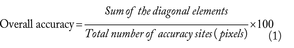 As indicated in Congalton (1991) and Moisa and Gemeda (2021), the overall accuracy was calculated by dividing all the pixels properly categorized by the total number of pixels in the matrix (equation (1)). Alam et al. (2020), Merga et al. (2022), Mishra et al. (2020), and Moisa et al. (2021) calculated the overall accuracy and Kappa coefficient (Khat) to measure the degree of agreement between the two maps in the form of a confusion matrix (Alam et al., 2020; Mishra et al., 2020; Moisa et al., 2021; (equation (2)).