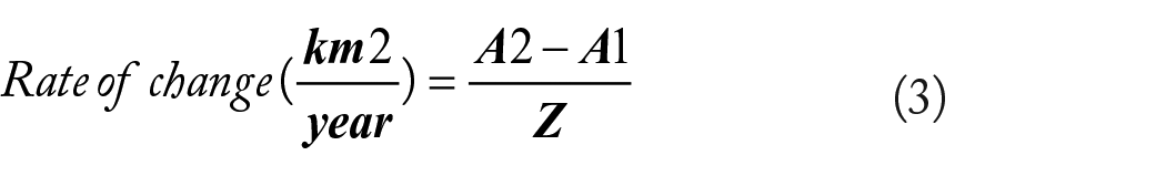 The quantity of altered area, extent of change utilized to assess the degree of change over time is determined using equation (3) (Abebe et al., 2019; Eyasu et al., 2019; Gessesse et al., 2017; Kabite et al., 2020; Moisa, Dejene, Merga, et al., 2022a).