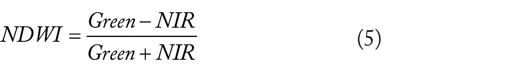 When modeling the thermal environment, the NDWI is used to simulate water areas, which often have significant thermal changes (Siqi & Yuhong, 2020; Zhou & Wang, 2011). Green band (band 2 for Landsat 5 and 7, band 3 for Landsat 8) and near infrared (band 4 for Landsat 5 and 7, band 5 for Landsat 8) reflectance measurements were used to build the formula (equation (5)). The Near-Infrared (NIR) and Green (G) channels are used to calculate the NDWI (Jackson et al., 2004).