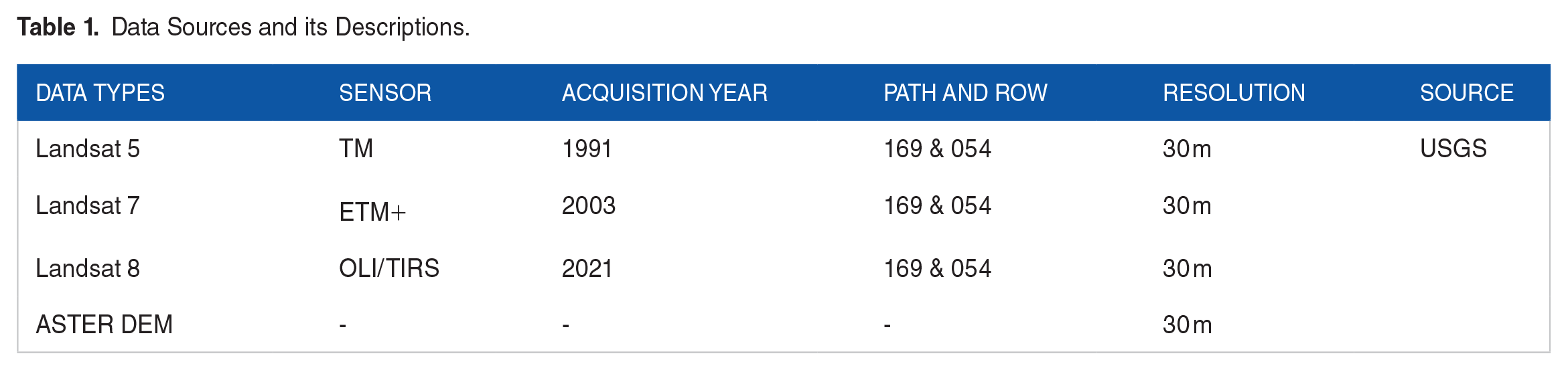 Landsat imagery for the years 1991 TM, 2003ETM+, and 2021 OLI/TIRS was obtained from the Earth Explorer website (http://eathexplorer.usgs.gov/) by path 169 row 54. These Landsat images were downloaded from cloud-free images during the dry season (January-February) (Table 1 and Figure 2). These Landsat images were used to calculate the LULC, NDVI, and NDWI.