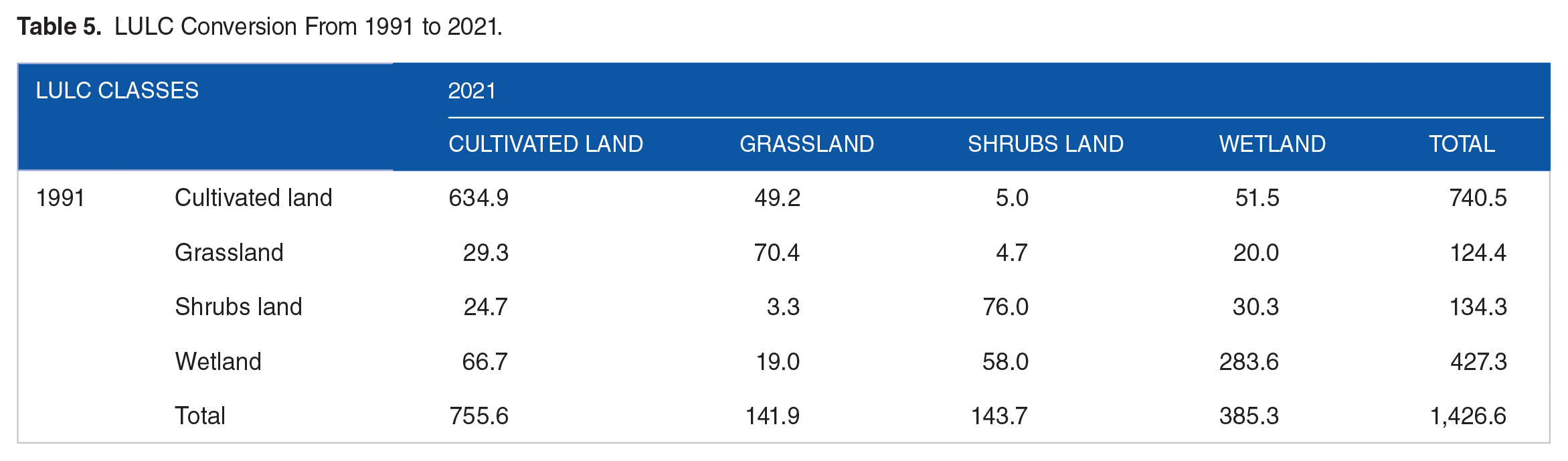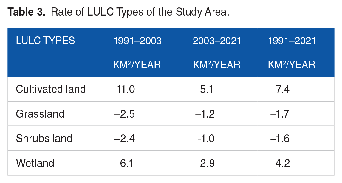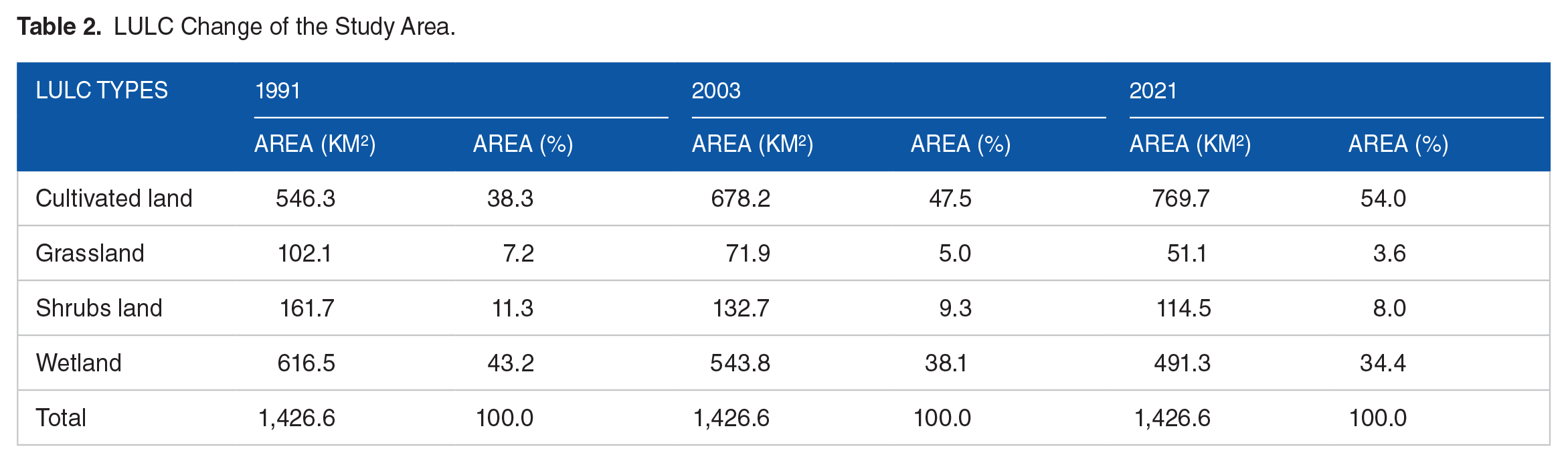 The LULC of the study area was classified into four classes as cultivated land, grassland, shrubland, and wetlands for the year 1991, 2003, and 2021 (Table 2; Figure 3). The results show that cultivated land was the most prominent LULC type in 1991, 2003, and 2021, with an area of 546.3 km2 (38.3%), 678.2 km2 (47.5%), and 769.7 km2 (54.0%), respectively. This clearly demonstrated that the amount of cultivated land increased over the study period.