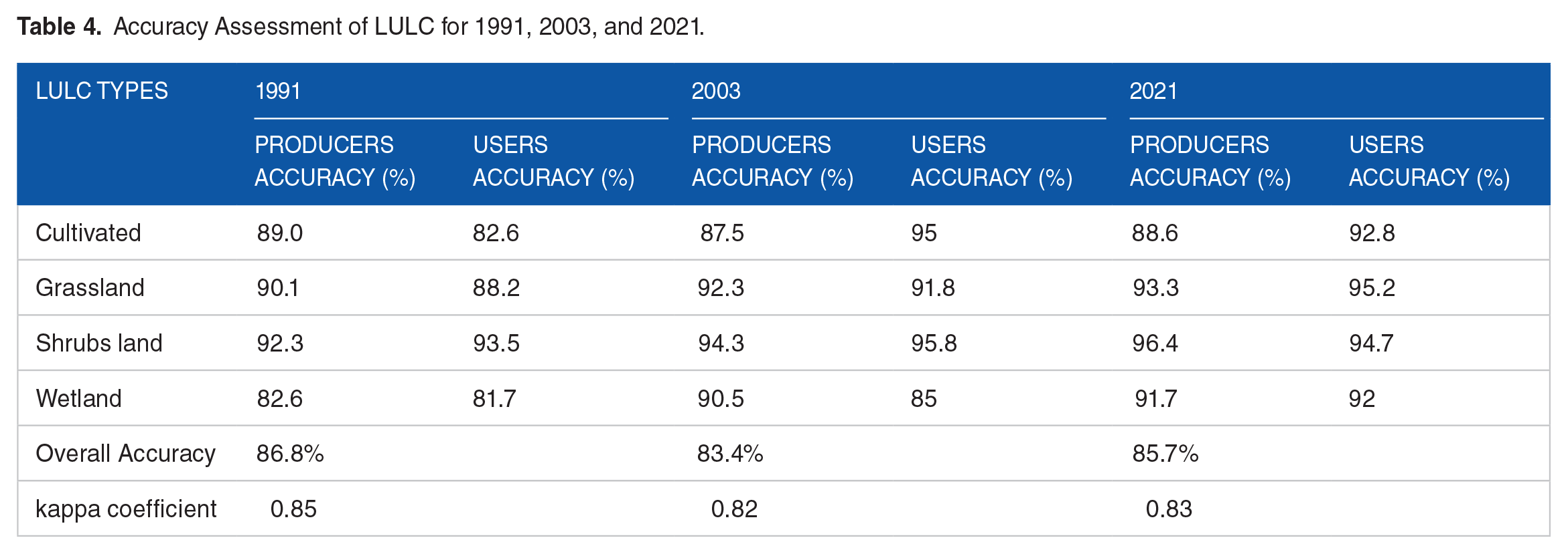 The accuracy of the classified LULC maps was assessed in the current study to ensure their trustworthiness. The reference data was compared to the classified LULC types. The total classification accuracy of the LULC accuracy assessments for the study periods 1991, 2003, and 2021 was 86.8%, 83.4%, and 85.7%, respectively. As a result, for the study periods 1991, 2003, and 2021, the kappa coefficients were 0.85, 0.82, and 0.83, respectively (Table 4).