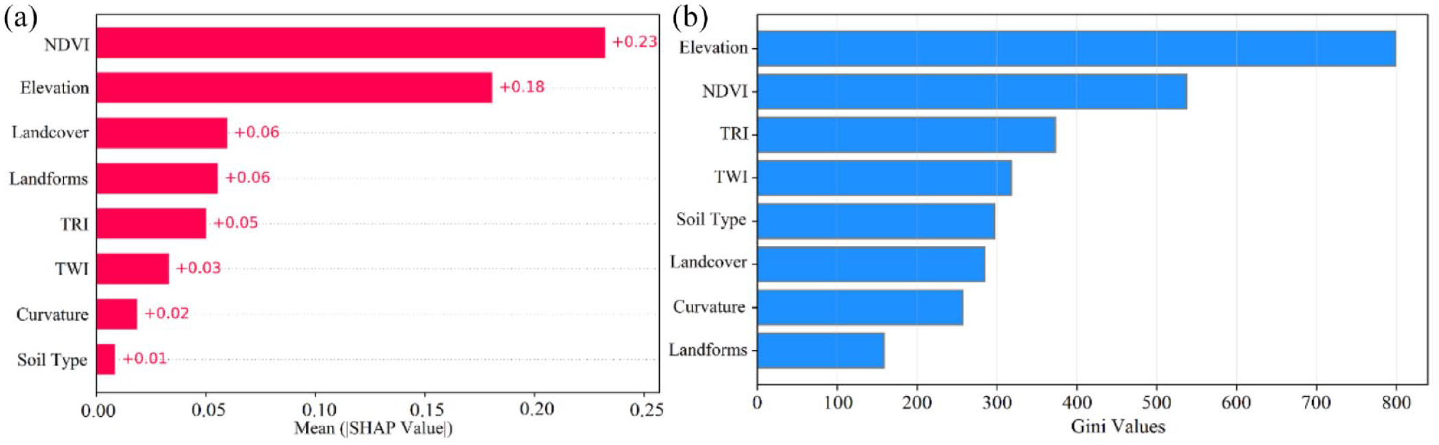Contribution of LCF in RF model output: (a) mean SHAP values and (b) Gini values.