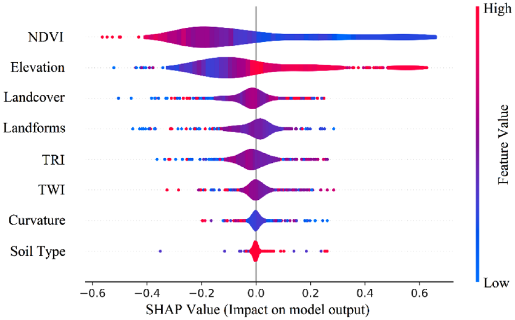 SHAP method provide both global and local interpretability to MLA. According to this method, most influent LCF on landslide susceptibility probabilities were determined. Results revealed that the Elevation and NDVI had the highest positive contribution, while Soil Type and Curvature had no major implications. In addition, it is worth mentioning that terrain and coverage factors had a significant contribution to the landslide occurrences in the study basin, considering that four out of the eight LCF modeled, were the most influential factors on landslide phenomena (Elevation, NDVI, Landcover, and Landforms).