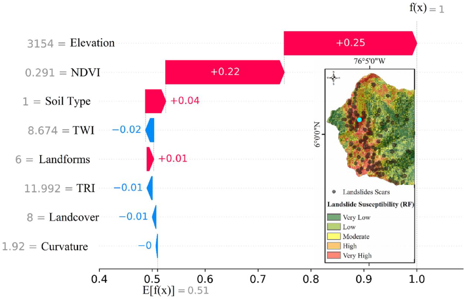 On the other hand, and as illustration of an example of local interpretability, in Figure 12, it is shown the SHAP values waterfall of a landslide scar pixel (cyan color) in the upper part of study basin, which was correctly classified as landslide with RF model. Again, in this case Elevation and NDVI have the most effect on prediction, whose values are in the conditioning factor class with higher frequency ratio (Table 2). Additionally, the values of Soil Type and Landform in this pixel, correspond to silty clay soils and open steep slopes prone to occurrence of landslides. The remain LCF have no major relevance on RF model output.