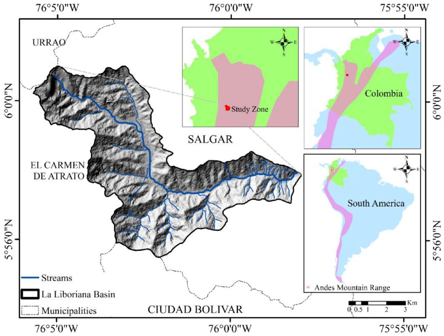Figure 3 shows the area corresponding to the case study in the “La Liboriana” River basin, located in the municipality of Salgar, in the southwest of the Department of Antioquia, western branch of the Colombian Andes. This basin joins El Barroso River basin, and both drain water into Cauca River, one of the most important rivers in the country (Hidalgo & Vega, 2021).