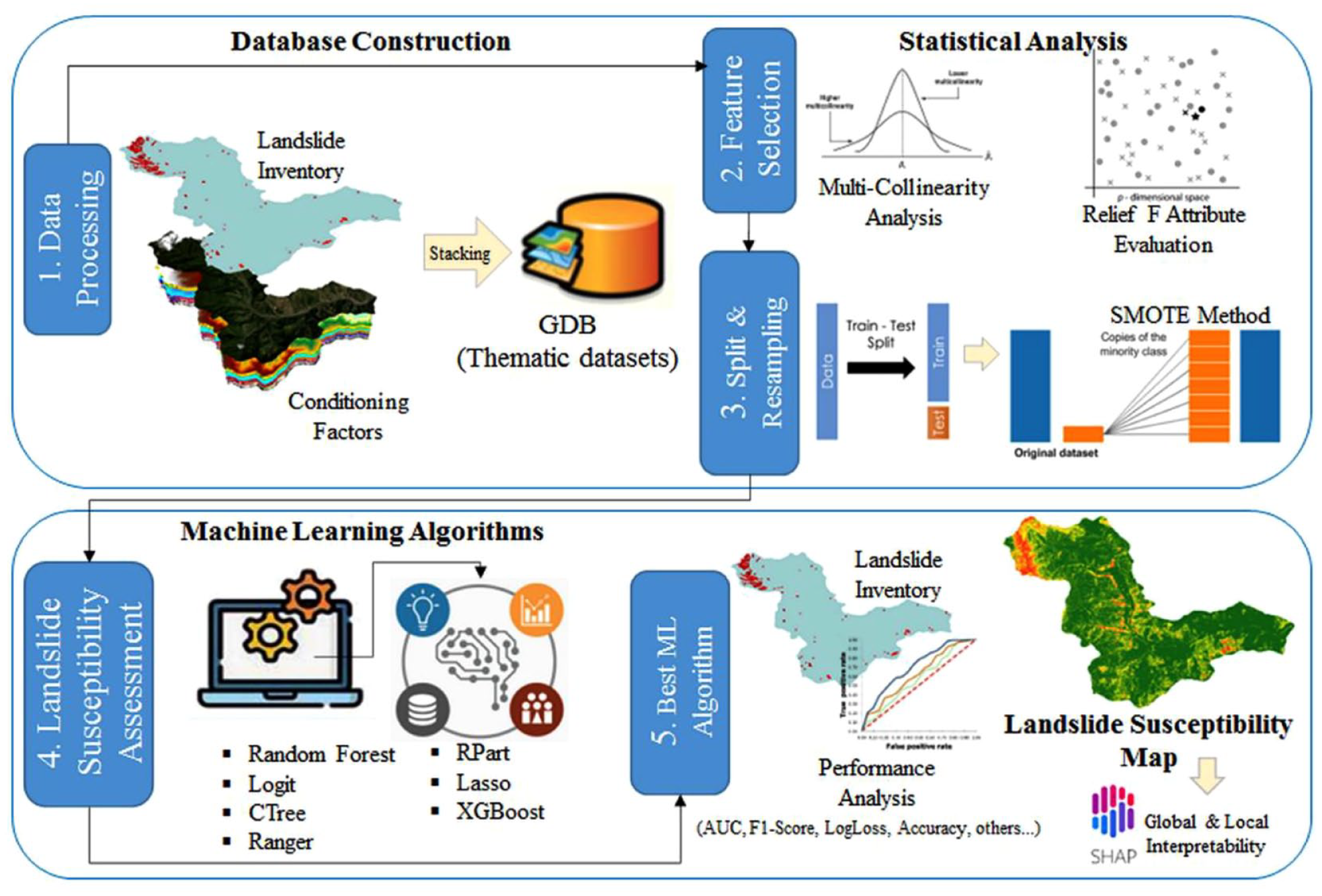 Seven supervised MLA were employed, two regression algorithms (Logistic) and five decision tree algorithms (Recursive Partitioning and Regression Trees [RPART], Conditional Inference Trees [CTREE], Random Forest [RF], Ranger, and Extreme Gradient Boosting Algorithm [XGBoost]). The LSMs were produced for each MLA. The LSA study was developed considering five phases: data processing, feature selection, dataset splitting and resampling, evaluation of the susceptibility, and comparison of the performance of the algorithms, as shown in Figure 4.