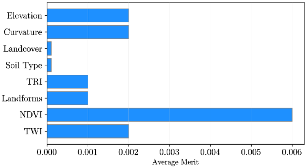 For LCF selection according to relative importance, a Relief F Method provided in WEKA open source (https://www.cs.waikato.ac.nz/ml/weka) was used. This method calculates a weight value (average merit) for each variable to quantify its relevance (Dang et al., 2020). Features with the weights exceeding a certain threshold are selected for analysis. Factors assigned zero weight have no contribution to landslide occurrence and therefore, must be removed from further analysis (Hong et al., 2018). This study applied a cross-validation strategy, a standard random 5-fold cross-validation for Relief-F attribute selection method.