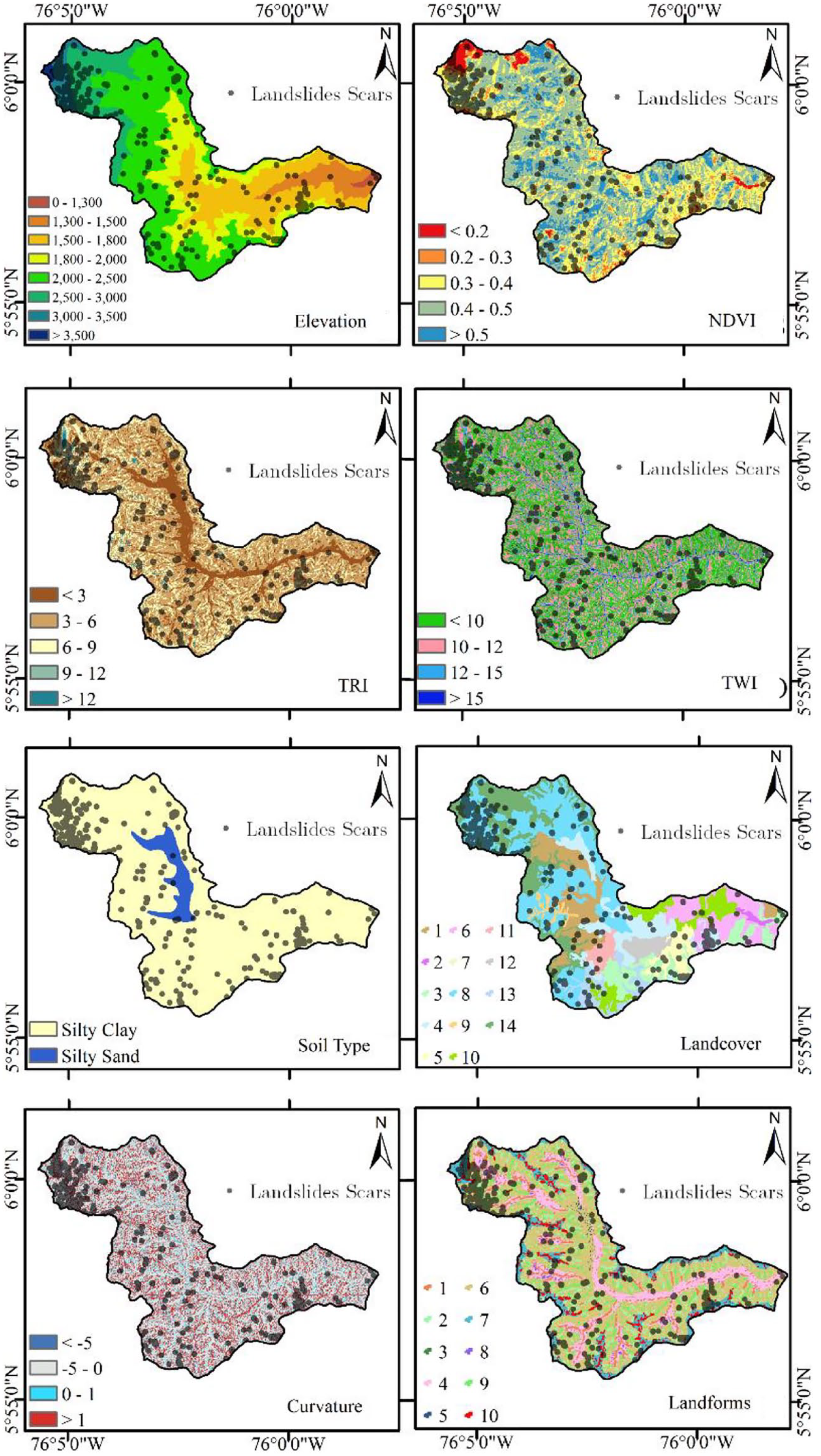 Figure 6 shows the spatial distribution of the chosen LCF for modeling and its value ranges. In general terms it can be noticed that the spatial distribution of the elevation factor shows the altimetric variation of the study area, showing a definite pattern with a marked trend of increasing low values from the east to higher values in the west. In addition, it is observed that most of the landslides have occurred at higher elevations. In fact, it can be noticed that the greatest occurrence of landslides in the basin corresponds to the elevation range between 3,000 and 3,500 m.a.s.l., where there are landforms with gradients of slopes greater than 45°.