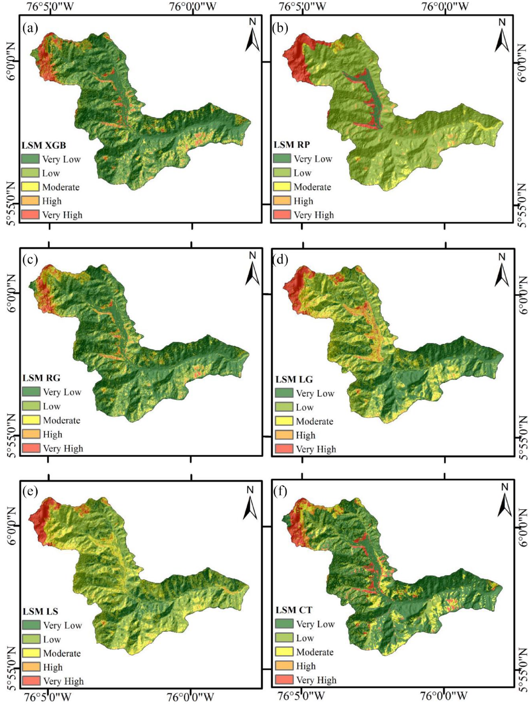 Landslide susceptibility maps using: (a) XGBoost, (b) RPART, (c) Ranger, (d) Logit, (e) Lasso, and (f) CTREE.