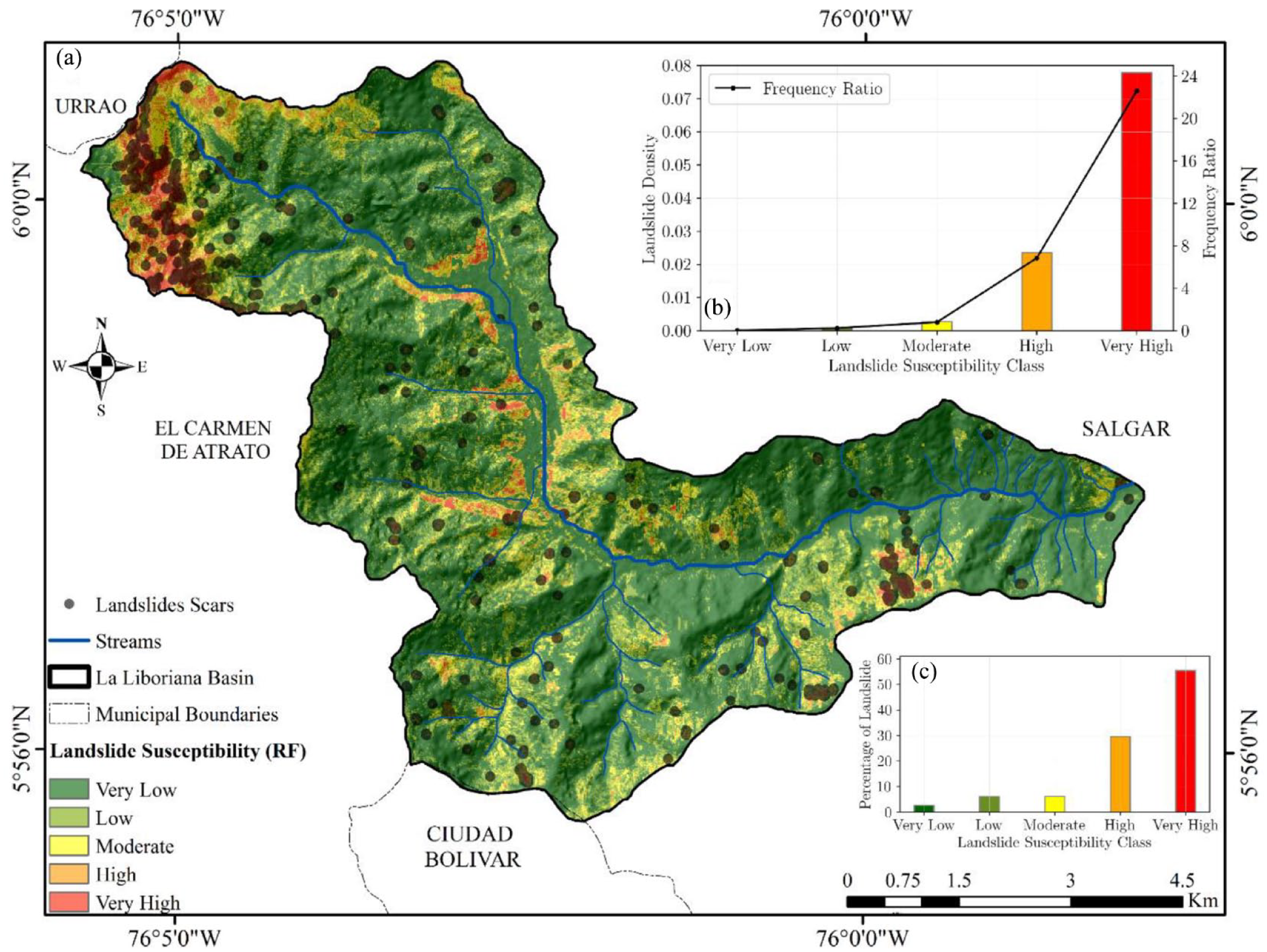 Finally, the distribution of landslides in the different susceptibility classes was statistically considered and an analysis of landslide density in the five susceptibility classes was performed. In order to assess whether the generated landslide susceptibility map meets the requirements, two principles are used: First, an ideal landslide susceptibility map has landslide density values that increase from lower to higher susceptibility class (Pradhan & Kim, 2016). Finally, the high-risk areas should account for a small percentage of the total area (Huang & Zhao, 2018). Figure 8b shows the frequency ratio and landslide densities for all classes. Indeed, the very high class has the highest landslide density (LD = 0.08) and landslide frequency ratio (FR = 22.6). Additionally, according to Figure 8c, more than 85% of the events recorded in the inventory occur in this class, according to the values determined with the RF model.
