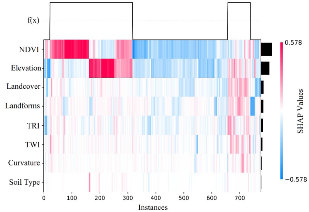 In order to provide global interpretability to the output of RF model, SHAP method was conducted. According to the SHAP values obtained for the test dataset, Elevation and NDVI are the most significant factors for predicting the occurrence of landslides based on SHAP values heatmap (Figure 9). In fact, almost 40% of the dataset has high SHAP values (red color) in both conditioning factors, associated to landslide occurrences while approximately in a 50%, the combination of low SHAP values (blue color) in all LCF is associated to non-occurrence of landslide. The remaining 10%, corresponds to a combination of medium SHAP values of all LCF which lead to landslide occurrence. The obtained SHAP values are consequents with the results of the mean decrease Gini values calculated previously (Figure 10), where both Elevation and NDVI has the higher importance.