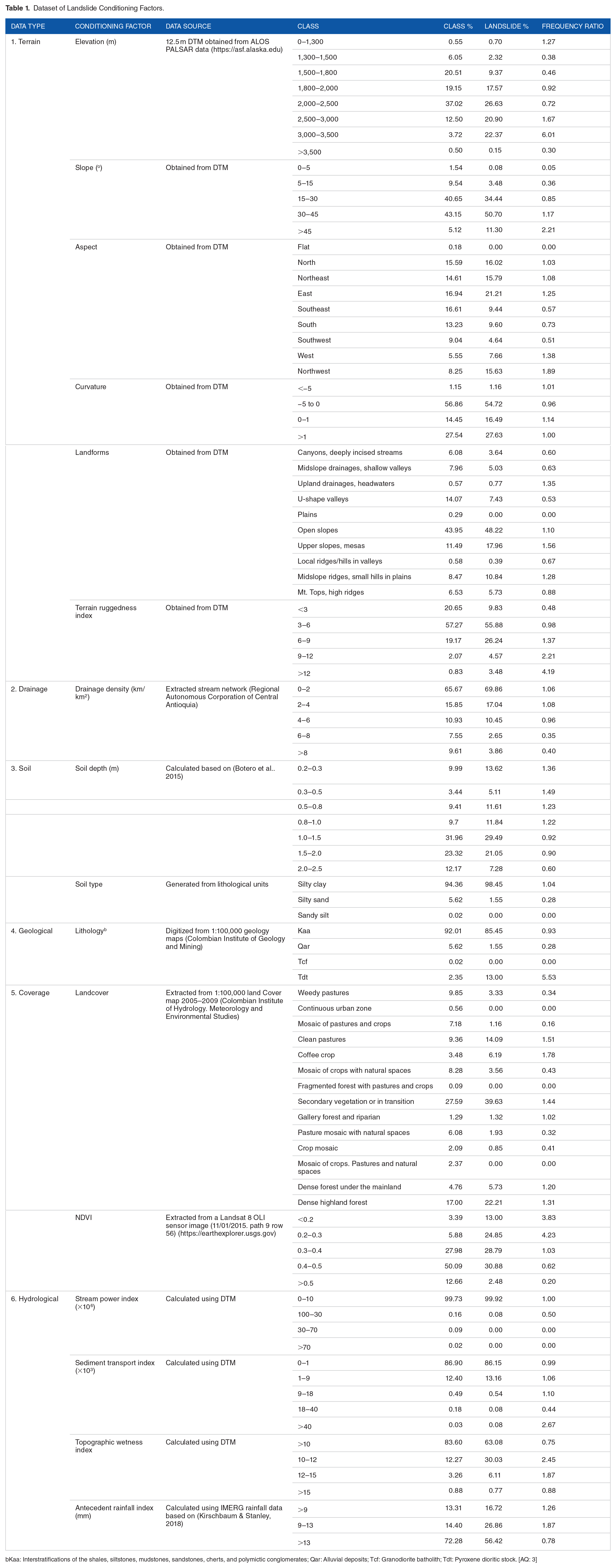 Frequency Ratio (FR) which considers the effects of conditioning factors on landslide occurrence (Z. Chang et al., 2020) was determined. FR values were calculated as the ratio between the percentage of landslides and the percentage of class of each LCF. An FR value greater than 1.0, indicates a higher correlation between landslide and conditioning factors; whereas an FR value that is lower than 1.0, suggests a lower effect on landslide.