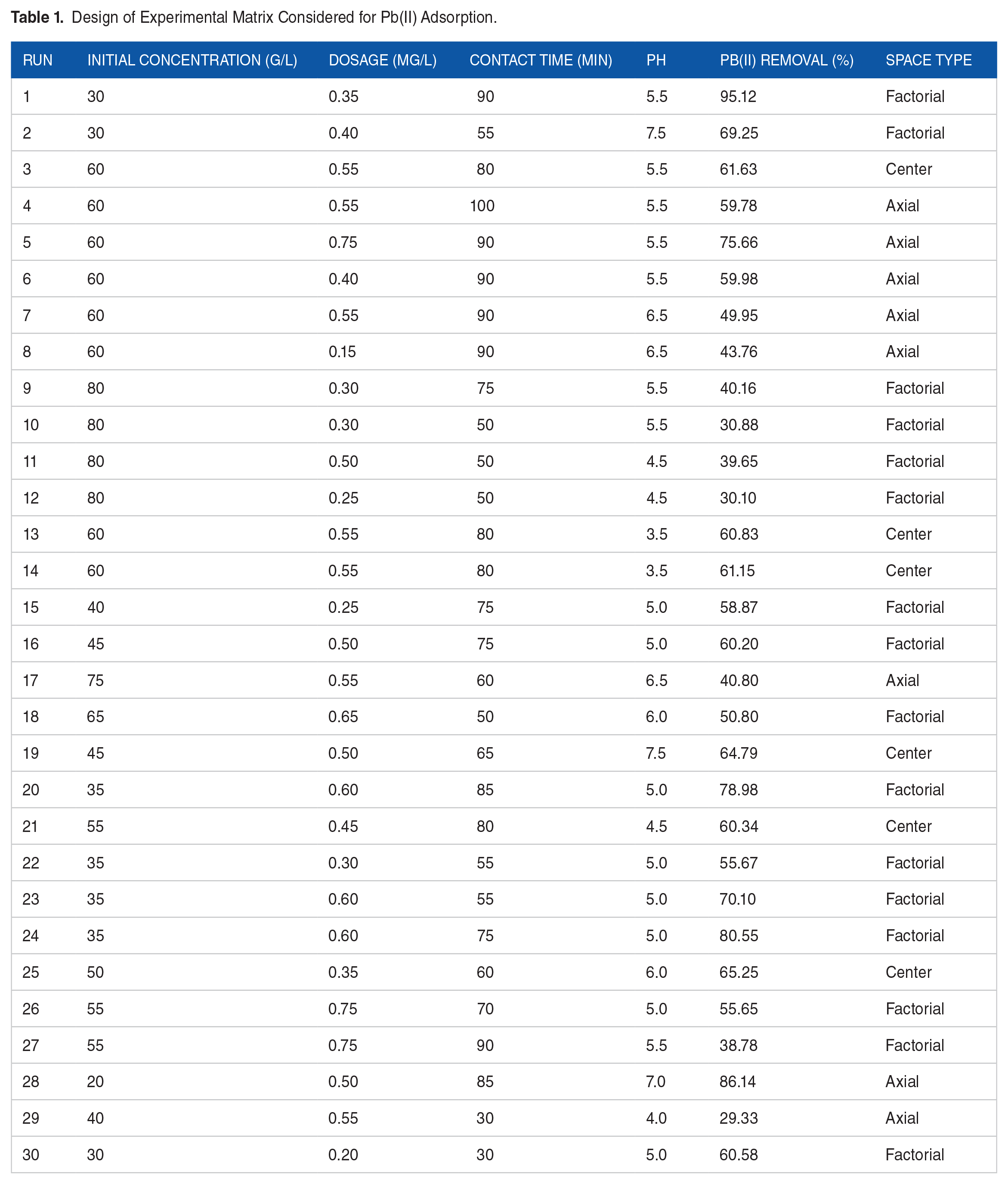 Design of Experimental Matrix Considered for Pb(II) Adsorption.