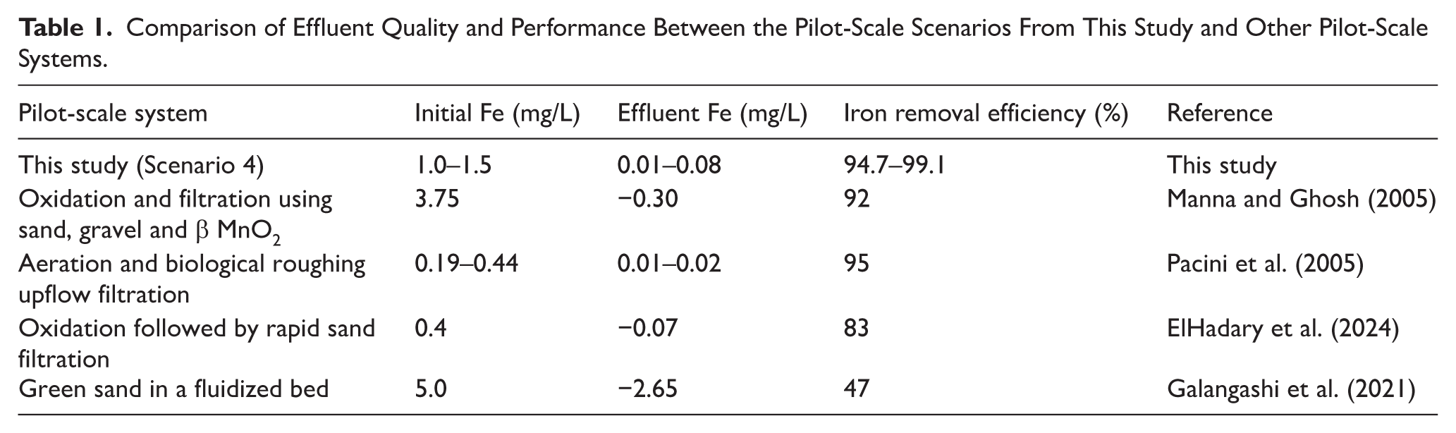 A pilot-scale plant was developed by some researchers for iron removal from water. Galangashi et al. (2021) have developed a pilot fluidized bed column containing greensand, where a 41.74% iron removal efficiency was achieved in a bed height of 19 cm (Galangashi et al., 2021). Bolobajev et al. (2022) have developed a pilot scale system containing hydrous manganese oxide slurry for iron removal from drinking water, where a 97% iron removal efficiency was achieved (Bolobajev et al., 2022). Pruss et al. (2021) have developed a pilot-scale system that consists of aeration and filtration units, where the iron concentration was reduced on average by 72% (Pruss et al., 2021). Another pilot-scale system was constructed to treat water quality extracted from the riverbank filtration (RBF) unit, which consists of oxidation and filtration units, where a 90% iron removal efficiency was achieved (ElHadary et al., 2024).