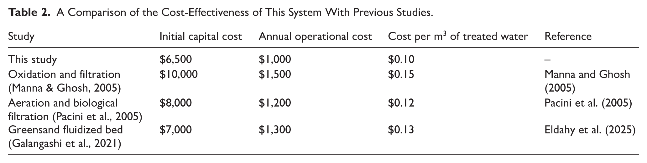 A comparison with other pilot-scale iron removal technologies, as shown in Table 2, demonstrates the cost-effectiveness of the proposed system. The cost per m3 in this study is lower than the range reported in previous studies ($0.12–$0.15 per m3), while achieving high removal efficiencies. This favorable cost-benefit ratio underscores the system’s potential for integration into riverbank filtration projects, particularly in cost-sensitive contexts.