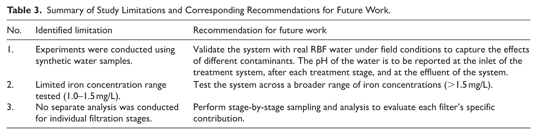 Even though the results of this study show that the proposed pilot-scale system for reducing iron concentration in drinking water is very effective and cost-effective, some limitations should be noted to help future research and large-scale use. The first limitation is that the experiments utilized synthetic water samples prepared in controlled laboratory settings, with iron concentrations ranging from 1.0 to 1.5 mg/L. The water extracted from actual riverbank filtration contains a mixture of dissolved and suspended particles, which can interact with oxidants and filtration media and influence the treatment performance. Additionally, the pH of the solution is a key parameter governing the oxidation kinetics of Fe²+ to Fe3+ and the subsequent hydrolysis and precipitation of Fe(OH)3 Consequently, the results may not entirely reflect the system’s behavior when treating natural water with more variable characteristics. On-site testing at riverbank filtration RBF units with actual groundwater samples is also essential to confirm the system’s performance under realistic conditions. The second limitation is that this study concentrated specifically on a limited range of iron concentrations (1.0–1.5 mg/L). However, in some RBF systems, iron concentration may reach 3 mg/L. Therefore, it is essential to conduct testing throughout a broader concentration range to determine the system’s scalability and reliability. The third limitation is that the water samples were not collected after each filter to evaluate their respective contributions to the overall iron removal efficacy. Consequently, stage-by-stage sampling and analysis should be performed in future research to evaluate each filter’s specific contribution and optimize the configuration.