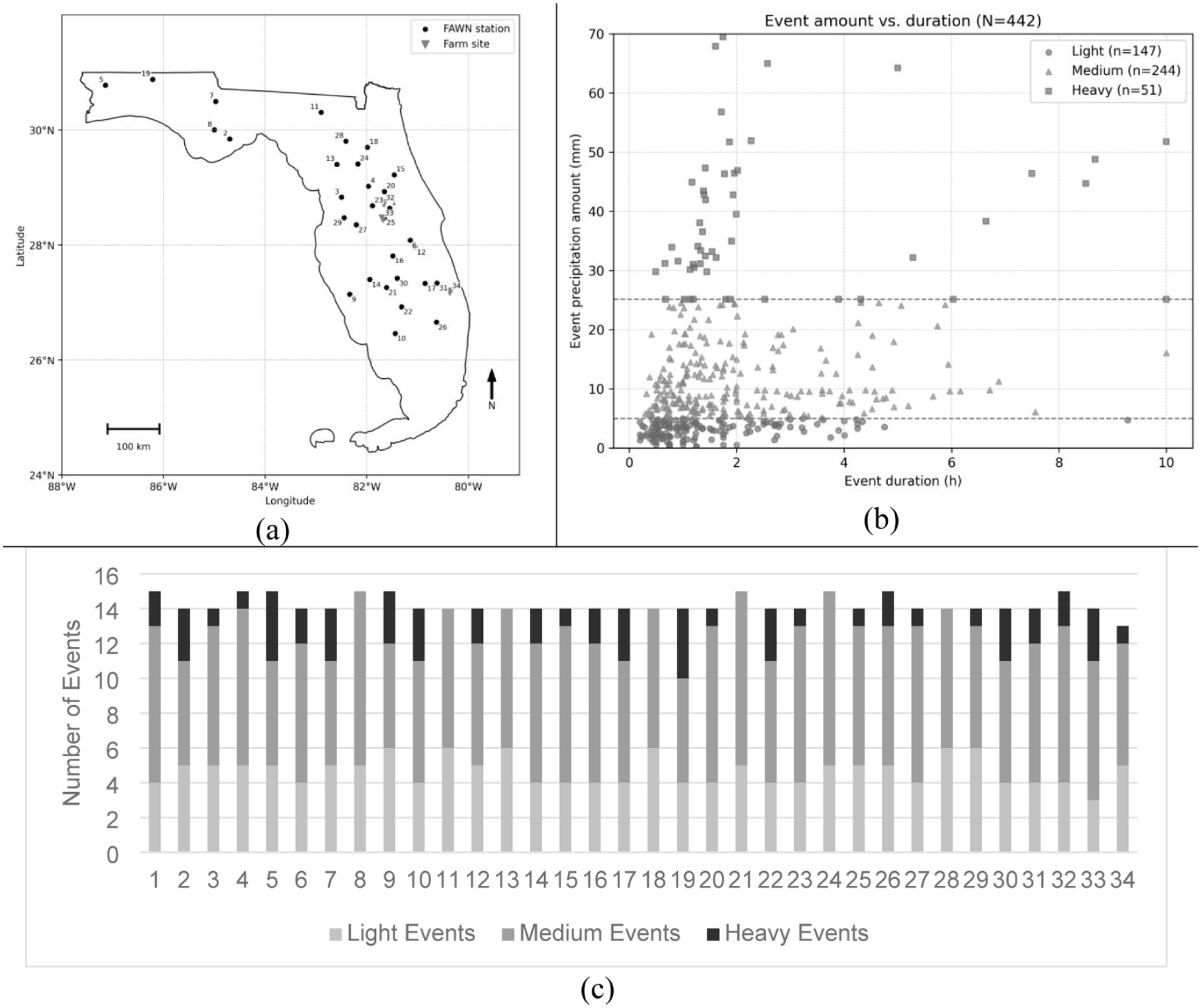 (a) Study area in Florida, USA, showing the geographic distribution of selected FAWN stations (black circles) and farm sites (gray triangles) with in-situ soil moisture sensors used in this study. The numbers of precipitation events are labeled to the corresponding sites, (b) scatter plot of event precipitation amount (mm) versus event duration (h) for all events (