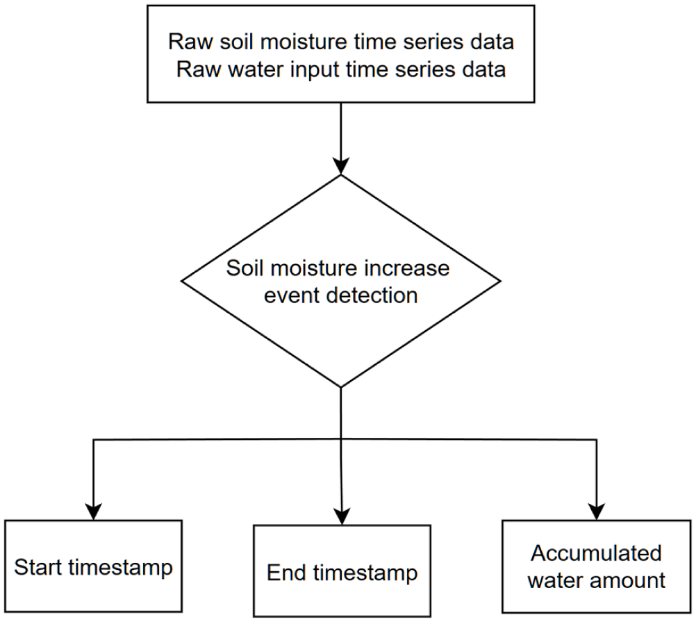 Soil moisture increases are driven by external water input events (e.g. precipitation or irrigation). Modeling soil moisture increases dynamics on an event basis makes it possible to isolate and analyze the fast infiltration and water redistribution, avoiding interference from soil moisture drying (e.g. evaporation). We define soil moisture increase events based on precipitation events determined by a 3-hr interevent dry period (see Appendix for details). The start of a precipitation event triggers a soil moisture event. The soil moisture event concludes when moisture levels peak, not necessarily when the precipitation ends. Figure 2 shows the workflow for identifying soil moisture increase events corresponding to water input events. Each detected event is characterized by three components: the start timestamp, end timestamp, and the accumulated water input amount during the event. The start timestamp is defined as the first upward deviation in soil moisture after the water input begins. The end timestamp is set when soil moisture reaches its peak or begins to decrease. This structured data format prepares data for subsequent model establishment.