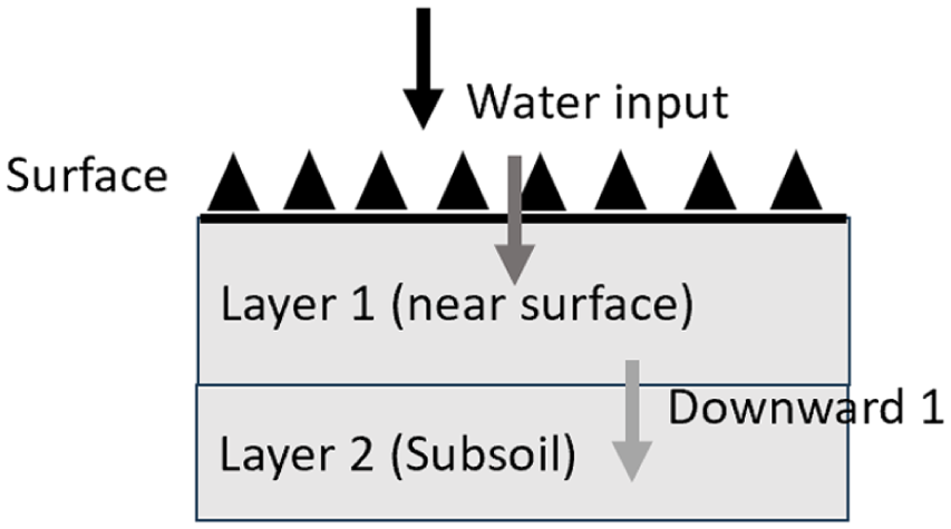 The water balance model in this project is designed by soil layers. Figure 3 shows how water redistributes when the water is input into the soil surface (Layer 1: Topsoil, 2 in). Under the assumption of negligible horizontal water movements, evaporation, crop water uptake and drainage, water is directly input into the soil and redistributed in two ways, either being retained in Layer 1 based on its soil water holding capacity or percolating downward into the subsoil layer (Layer 2) as Downward 1.